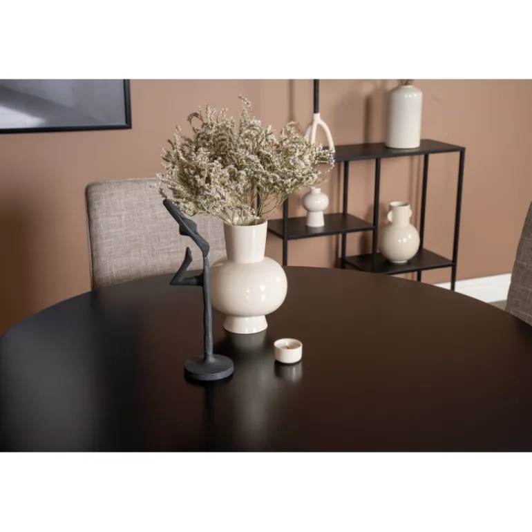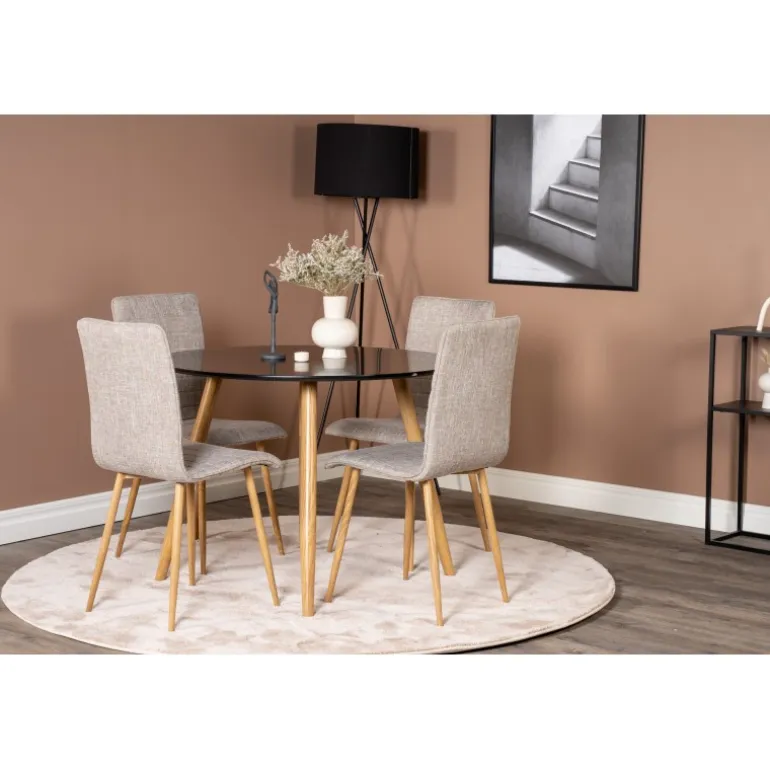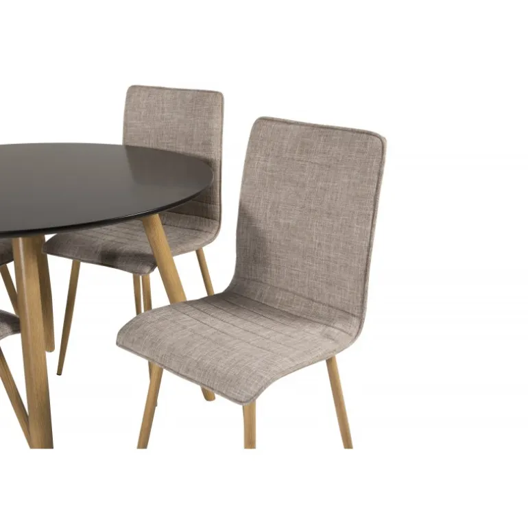 Klassisk Spisebordssæt, der passer til de fleste hjem! En flot kombination af spisebord fra Palace-serien og spisebordsstole fra Windu-serien. Spisebordets bordplade er i sort MDF, hvilket giver et stilfuldt og moderne udtryk. Stolene er i lys grå polyester linned, som tilføjer et naturligt og indbydende look til dit spiseområde. Vær opmærksom på, at bordet kræver samling.