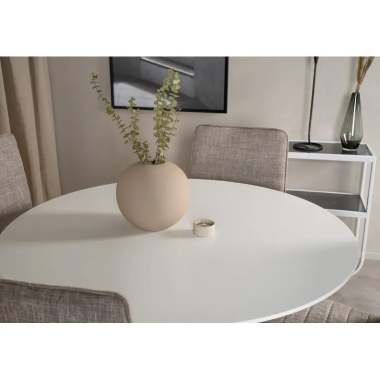 Klassisk Spisebordssæt, der passer ind i de fleste hjem! En flot kombination af spisebord fra Palace-serien og spiseborde fra Windu-serien. Hvid MDF-bordplade med naturfarvede detaljer og lysegrå stole med komfortable sæder. Dette elegante sæt er ideelt til enhver spisestue og tilbyder både stil og funktionalitet. Perfekt til daglig brug og nem at vedligeholde med korrekt pleje. Husk, at samling er påkrævet.