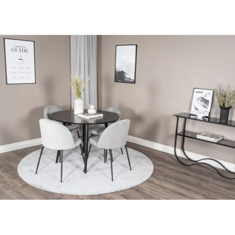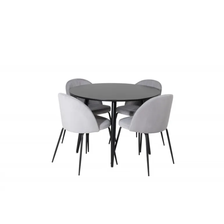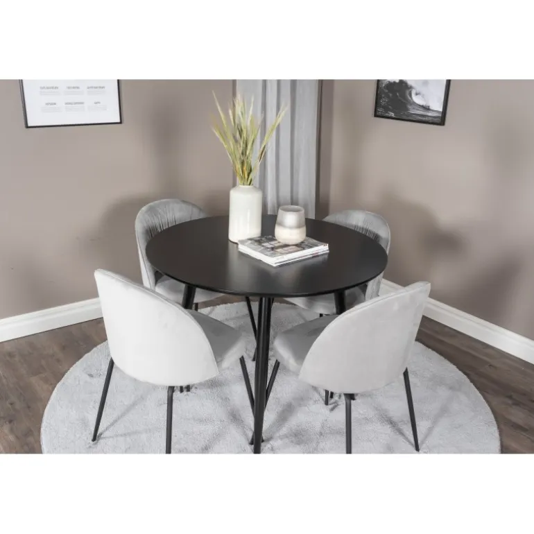 Et moderne Spisebordssæt i stilfuld gråskala! Spisestolene i Wrinkles-serien er ikke kun smukke for øjet, men også utroligt komfortable. Her sammen med vores runde spisebord Plaza med en elegant sort bordplade. Lad dig og din indretning inspirere af dette iøjnefaldende Spisebordssæt, der aldrig går af mode.