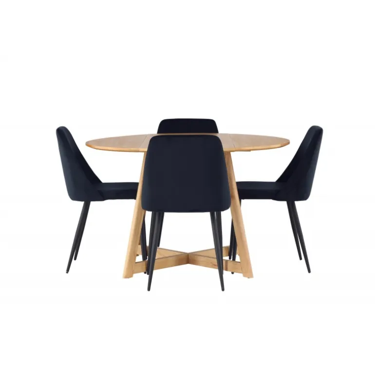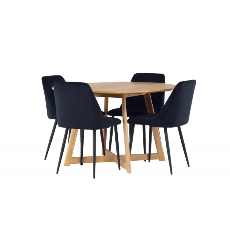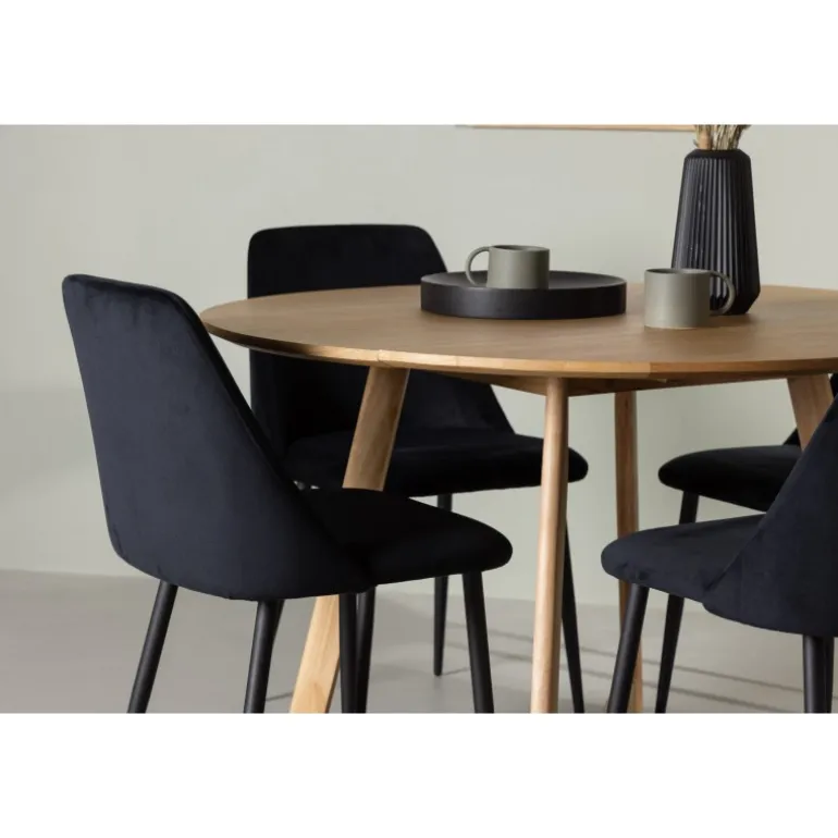 Skab en elegant og trendy atmosfære i dit hjem med dette vidunderlige Spisebordssæt i nordisk design! Dette smukke, runde spisebord fra Yakidon-serien i gummitræ har en flot egefarvet finish, der bidrager til et klassisk blikfang i stuen. Med sin runde bordplade og let udadvendte ben mødes stil og funktionalitet perfekt. Sammen med vores sorte spisebordsstole fra Night-serien får du en fantastisk kombination. Disse stole har et eksklusivt fuldt polstret sæde i sort fløjlstof og elegante stoleben, der matcher i sort farve. Stolens design bidrager til en indbydende og modebevidst atmosfære, hvilket gør hvert måltid luksuriøst og hjemligt. Dette er et Spisebordssæt, der er lige så velegnet til hverdag som til fest. Inviter dine kære, lad latteren flyde og nyd øjeblikke, hvor ingen ender på kanten!