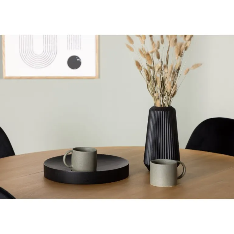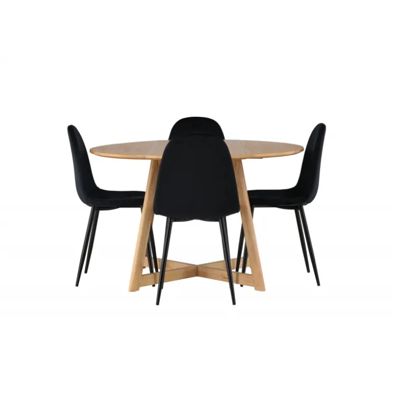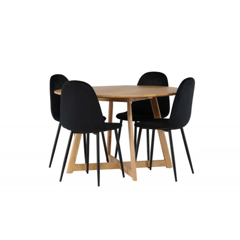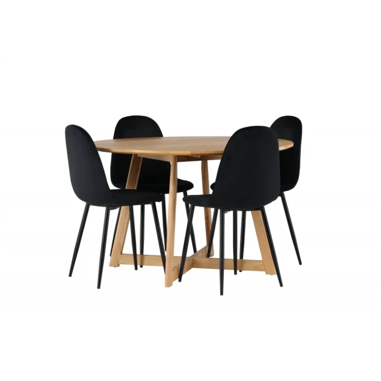 Velkommen hjem til en perfekt kombination af elegance og funktionalitet med dette smarte Spisebordssæt, der står tidens prøve! Vores tilpasselige spisebord Yakidon har to foldbare ender, der tilpasser sig dine skiftende behov. Uanset om du har brug for ekstra plads til en festlig lejlighed eller foretrækker en mere intim middag for to, kan du nemt justere bordets størrelse efter dine præferencer. De let udadgående ben, der konvergerer i et kryds på gulvet, giver bordet et distinkt og stilfuldt udseende. Fremstillet helt af egetræs-lignende MDF og gummitræ, er det nemt at holde rent med hjælp fra vores plejeinstruktioner. Her er det parret med stole fra Polar-serien. De fuldt polstrede stole, med ben i sort pulverlakeret metal og den vidunderligt afrundede ryglæn og sæde i sort velourstof med blød polstring, skaber en perfekt balance mellem komfort og design. Stop med at gå på kompromis og lad dette Spisebordssæt være hjertet i dit hjem. Skab mindeværdige øjeblikke med din familie og venner i stil, komfort og elegance. Det er tid til at løfte dine middagsselskaber til et nyt niveau!
