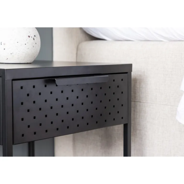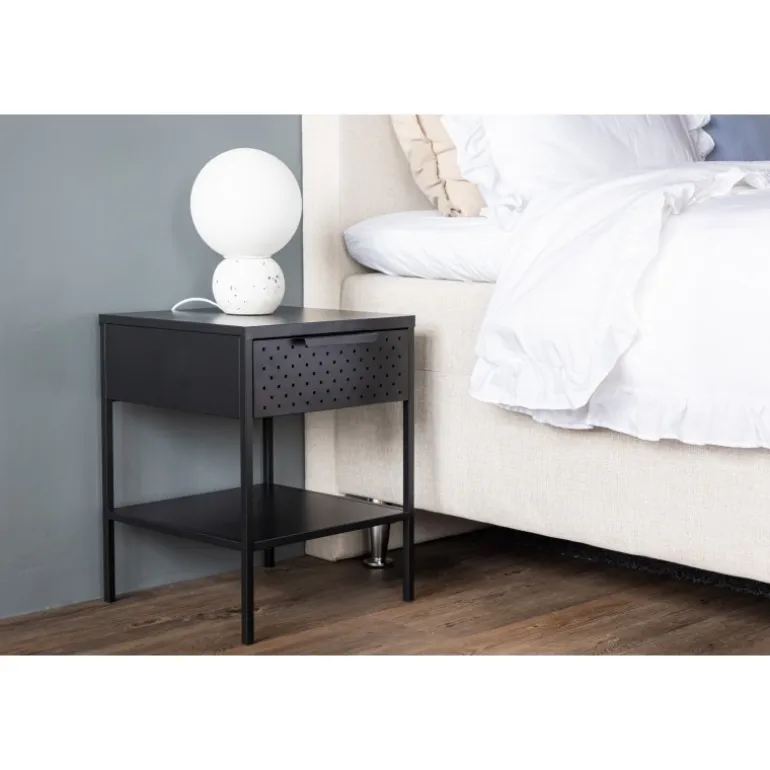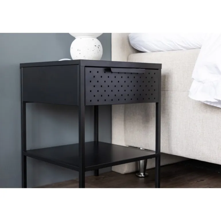 Forvandl dit soveværelse til en oase af orden og elegant design med vores sorte sengebord, Sacramento. Med sit moderne nordiske design og rene linjer, tilbyder dette sengebord en perfekt balance mellem funktion og æstetik! Med dette sengebord kan du nemt nyde den praktiske opbevaring, som skuffen giver, hvor du kan have alt, hvad du har brug for, inden for rækkevidde. Med hylden nedenunder kan du fremvise din yndlingsbog eller andre smukke dekorationer og lade din personlighed skinne igennem. Det pulverlakerede sorte stål tilføjer et strejf af elegance til sengebordet og gør det nemt at matche med din samlede indretning. Hvert eneste detalje er omhyggeligt designet for at skabe en harmonisk atmosfære i dit værelse. Men dette alsidige sengebord behøver ikke at være begrænset til soveværelset. Det fungerer vidunderligt som sengebord, men kan også placeres ved siden af sofagruppen eller endda i badeværelset. Det tilføjer et moderne touch til hvilket som helst rum, det placeres i, og komplementerer din stil på en subtil måde. Med Sacramento sengebordet får du ikke kun en funktionel opbevaringsløsning, men også en æstetisk behagelig interiørdetalje. Lad dit soveværelse eller stue afspejle din unikke smag med Sacramento – et elegant sengebord, der tilføjer det ekstra touch af noget specielt!
