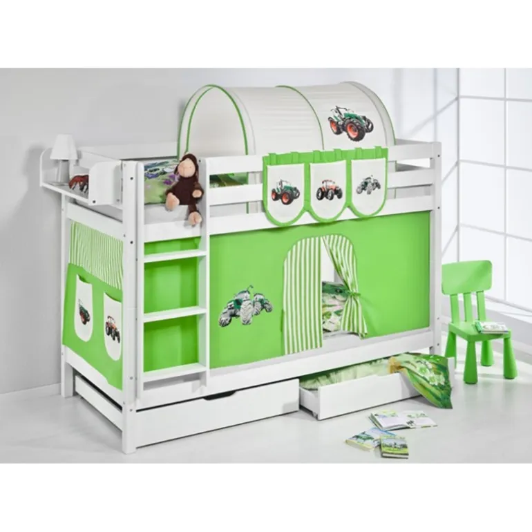 Inkl.: Forhæng med Grøn gravko-tema, 2 bundskuffer samt madrasser.