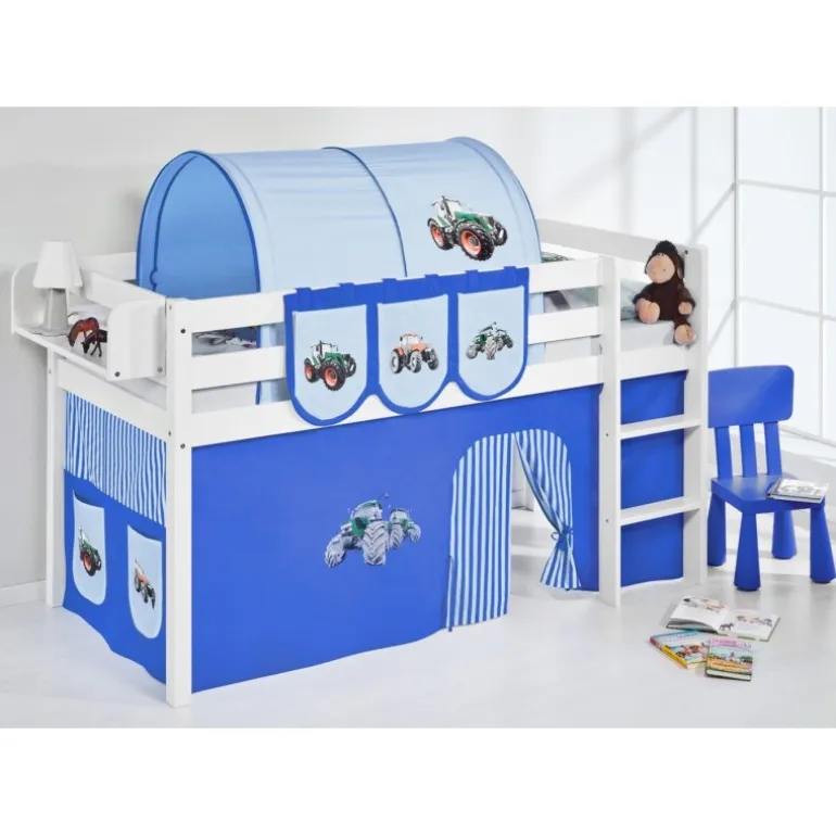 Halvhøj seng fra serien Bumle inklusiv forhæng med blåt gravko tema samt lamelbund og madras. Sengen er udstyret med flytbar stige med god brede trin, som kan monteres i enten højre eller venstre side. Bumle er serien til dig som går op i kvalitet og tidløst design men ikke vil betale for dyre mærkevarer.