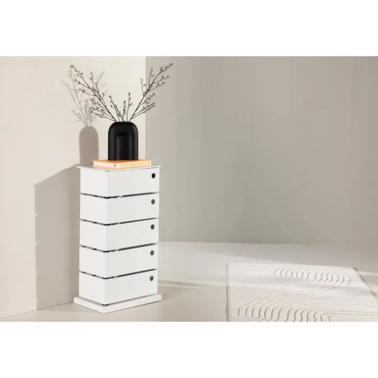 San Carlos skuffen er den ultimative løsning til moderne hjemmedekoration. Denne elegante skuffe i en smuk beige farve har et strålende design med et strejf af moderne stil. Med sine fire opbevaringsskuffer tilbyder San Carlos masser af plads til at organisere dit hjem. Det, der gør denne skuffe unik, er, at skufferne åbner i modsatte retninger, hvilket giver en elegant asymmetri og et legende touch til designet. Denne smarte funktion gør det nemt at få adgang til dine ejendele fra forskellige vinkler og skaber en interessant visuel dynamik. Dens moderne og minimalistiske design passer perfekt ind i ethvert rum og hjælper dig med at optimere pladsen med stil. Giv dit hjem den opbevaringsløsning, det fortjener, med San Carlos skuffen og løft din indretning til nye højder af stil og funktionalitet.