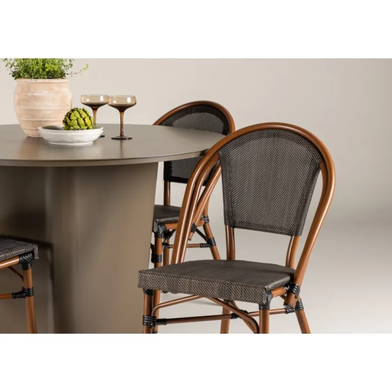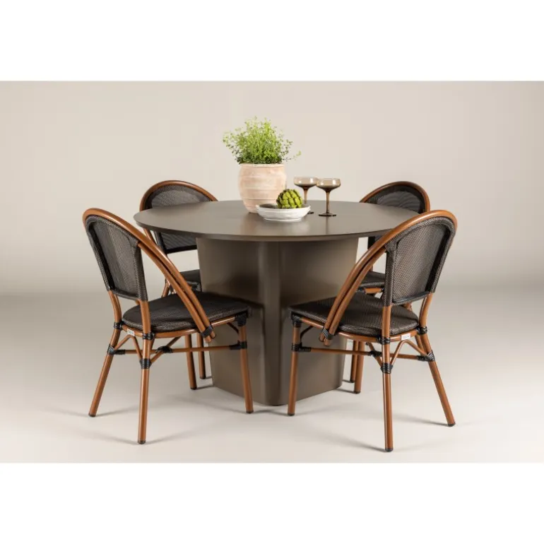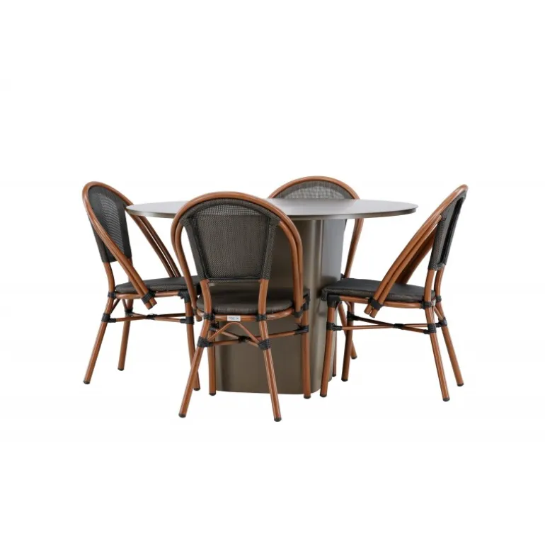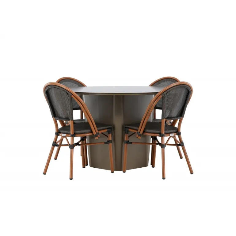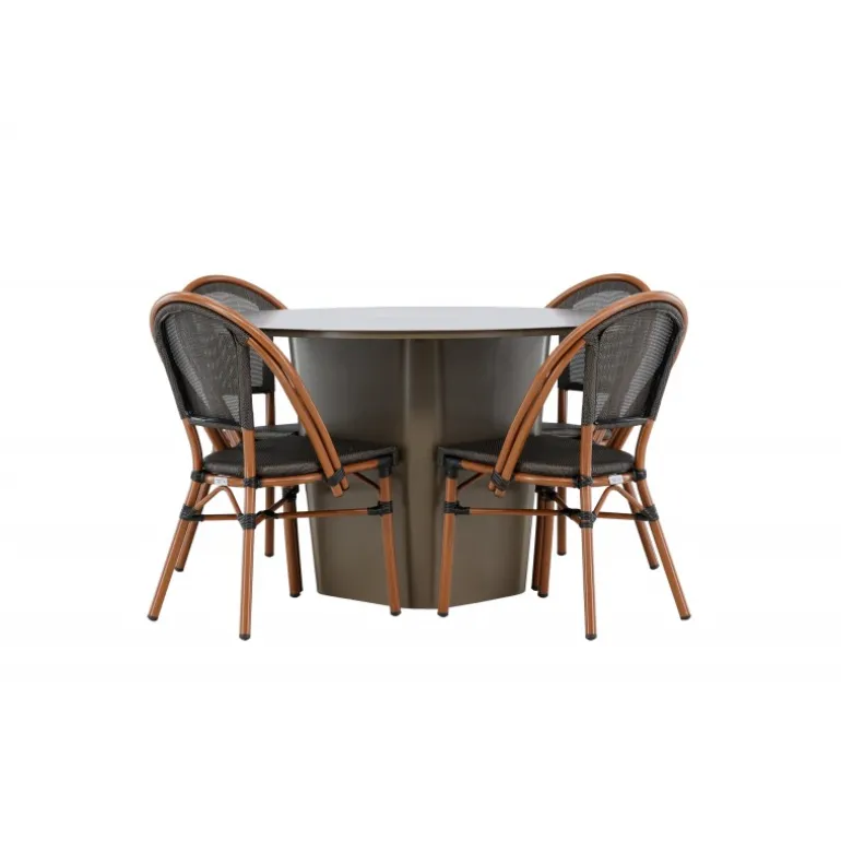 Oplev den perfekte spiseplads til samvær med venner og familie med vores nye Loungesæt – Havemøbelsæt – Guarda og Santa Fe. Med en jordnær atmosfære og et iøjnefaldende design, hæver dette ensemble dit udendørsmiljø til nye højder. Guarda-stolene er fremstillet med fokus på både stil og komfort. Deres sorte sæder i teslin-materiale kombinerer elegance med komfort, mens den brune aluminiumsramme giver stabilitet og et naturligt udseende. Disse stole er designet til at være både komfortable og trendy, perfekte til lange udendørs sammenkomster. Santa Fe-bordet er midtpunktet i dette Loungesæt – Havemøbelsæt med en generøs diameter på 120 cm. Bordet er lavet af brunt aluminiumsmateriale, hvilket giver et slankt og moderne design, der passer perfekt til nutidens udendørsmiljøer. Dette Loungesæt – Havemøbelsæt er ideelt til udendørs brug og skaber en atmosfære af kammeratskab og venskab med sit jordnære design. Med fire inkluderede stole er dette sæt komplet til at skabe mindeværdige øjeblikke og nyde afslappede udendørs måltider.