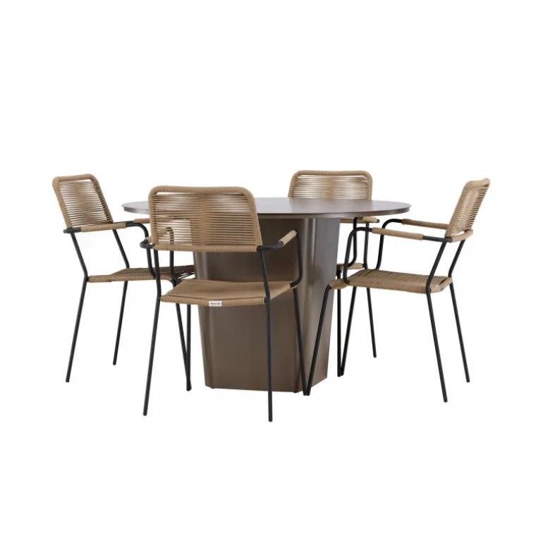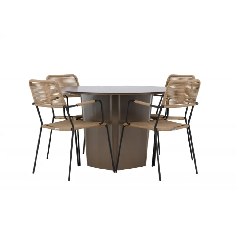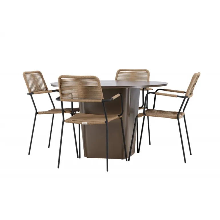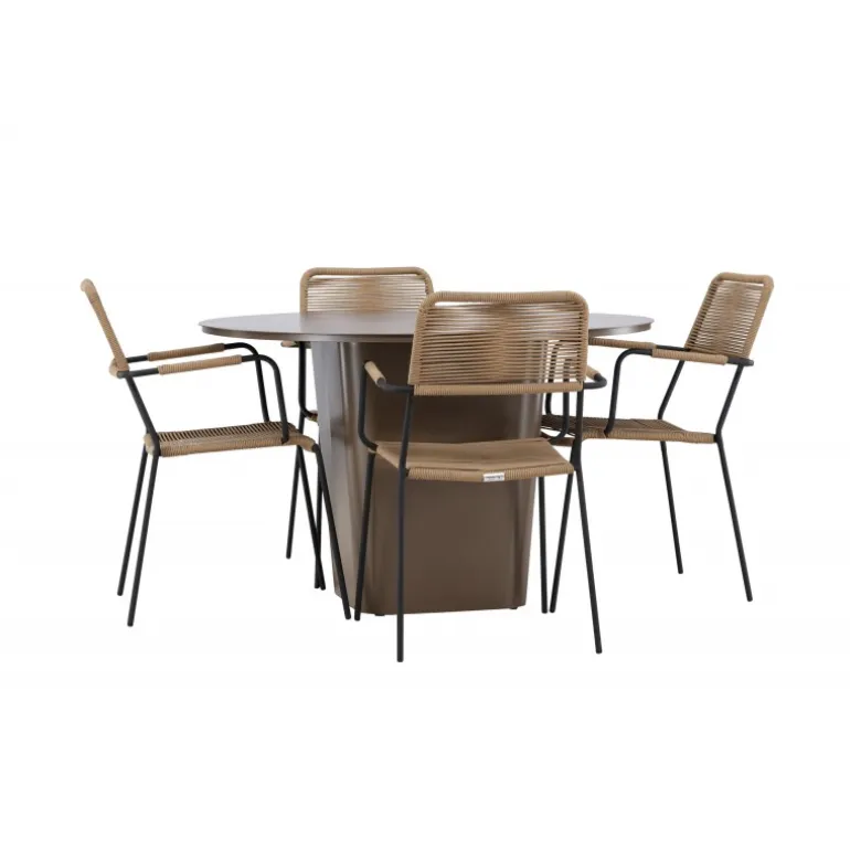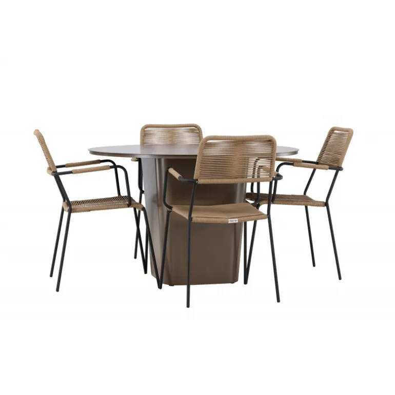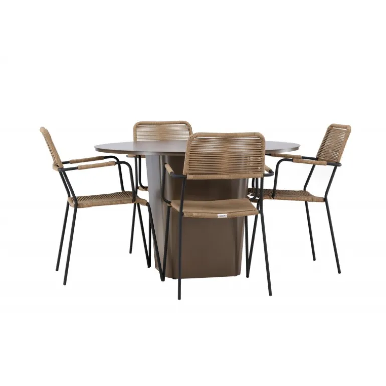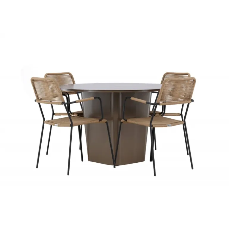 Oplev den perfekte kombination af stil og komfort med vores Loungesæt – Havemøbelsæt – Lindos og Santa Fe. Med en fremragende design og en varm atmosfære, vil dette sæt løfte dit udendørsmiljø til det næste niveau. Lindos-stolene er skabt med et elegant og minimalistisk design. Deres sæder er vævet i brunt rebmateriale, hvilket ikke kun giver en varm atmosfære, men også en komfortabel siddeoplevelse. Stolens ben er lavet af sort stål, som tilbyder stabilitet og et moderne touch til det samlede udseende. Santa Fe-bordet fungerer som midtpunktet i dette Loungesæt – Havemøbelsæt, fremstillet af robust brunt aluminiumsmateriale. Med en imponerende diameter på 120 cm, giver det masser af plads til familiemiddage eller afslappede sammenkomster med venner udendørs. Dette Loungesæt – Havemøbelsæt er ideelt til udendørs brug og skaber en minimalistisk atmosfære med sit elegante design. Med fire inkluderede stole er dette sæt komplet og giver en indbydende og stilfuld følelse til dit udendørsmiljø.