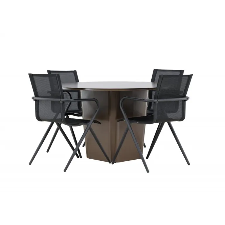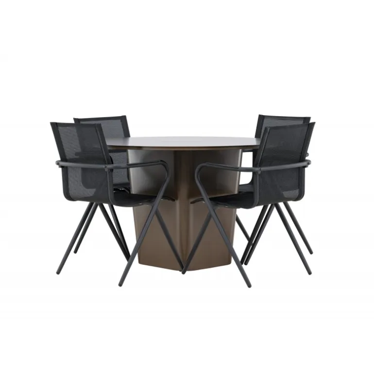 Opdag det perfekte Loungesæt – Havemøbelsæt til dit udendørsområde med vores elegante ensemble bestående af Santa-bordet og Alina-stolene. Santa-bordet er centrum for din udendørs spiseoplevelse med en generøs diameter på 120 centimeter. Lavet af aluminium i en smuk brun nuance, udstråler dette bord en følelse af klasse, der passer perfekt til dit udendørsmiljø. Alina-stolene er den ultimative komplement til Santa-bordet. Lavet af aluminium i en elegant sort farve, tilbyder disse stole både stil og komfort til din udendørs afslapning. Med fire inkluderede stole er dette Loungesæt – Havemøbelsæt ideelt til at samle familie og venner til mindeværdige øjeblikke under åben himmel. Giv dit udendørsområde den perfekte atmosfære til spisning og afslapning med vores Santa og Alina Loungesæt – Havemøbelsæt.