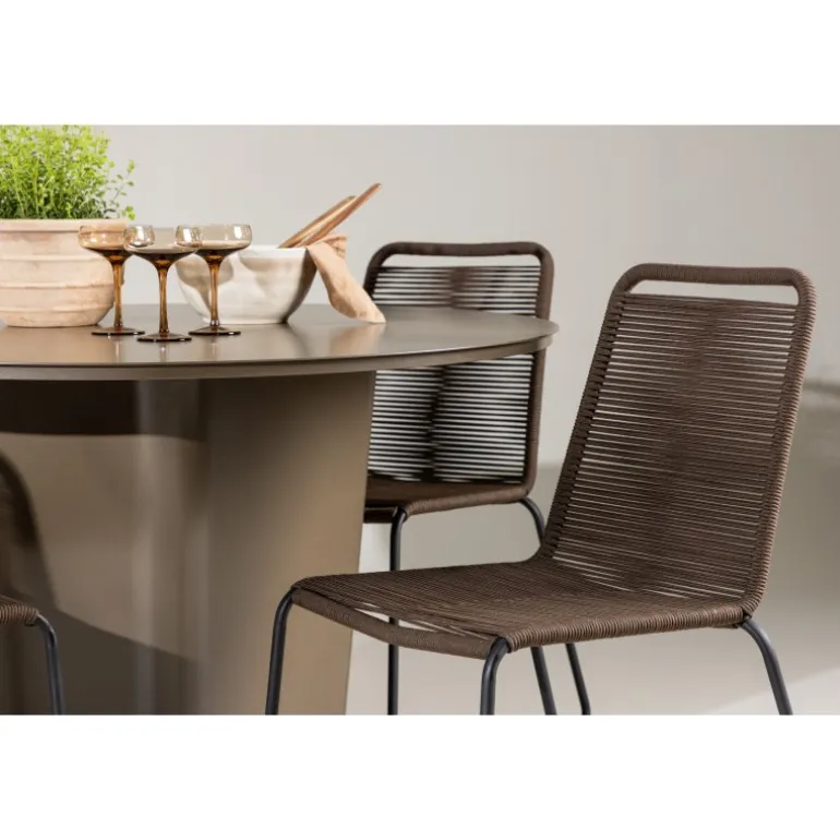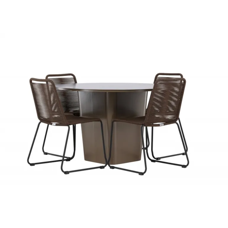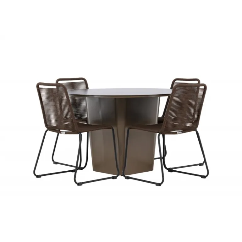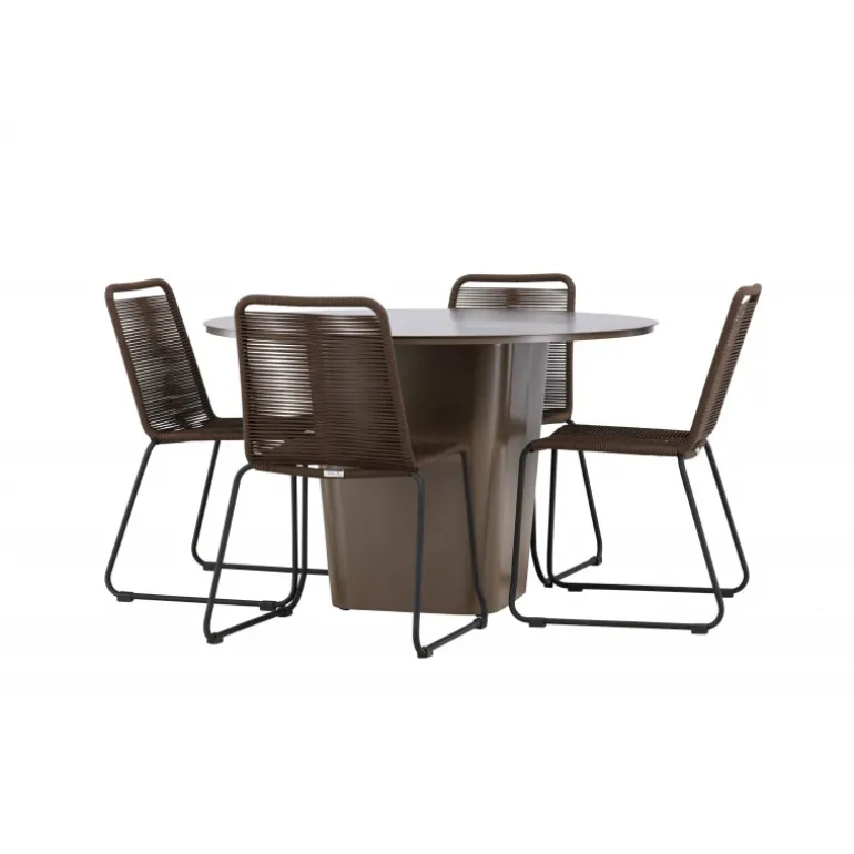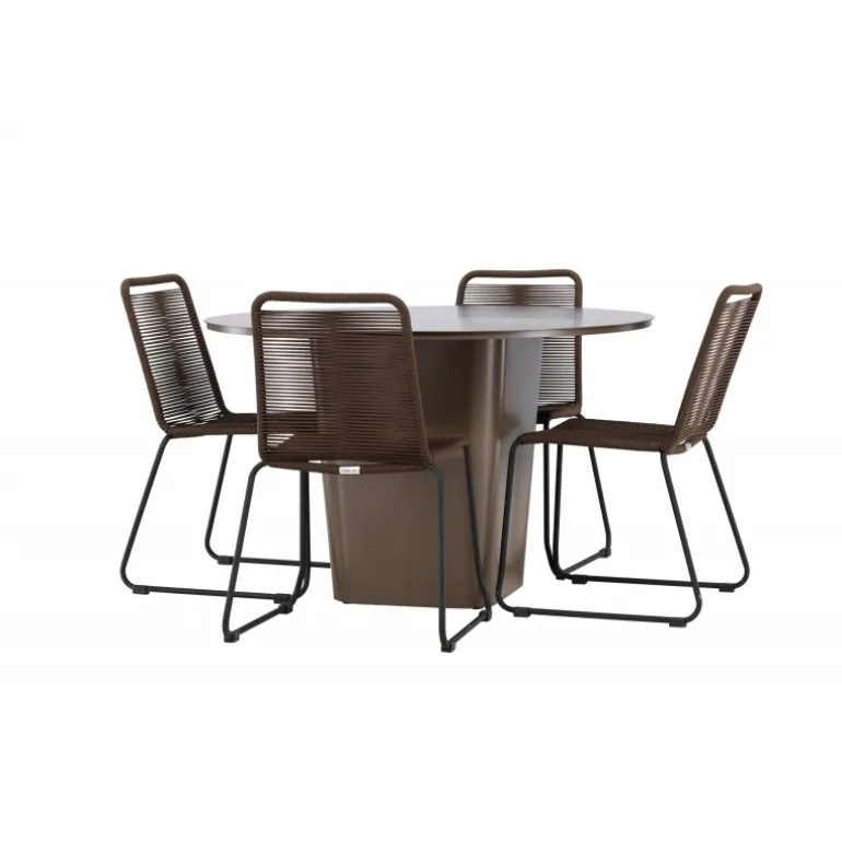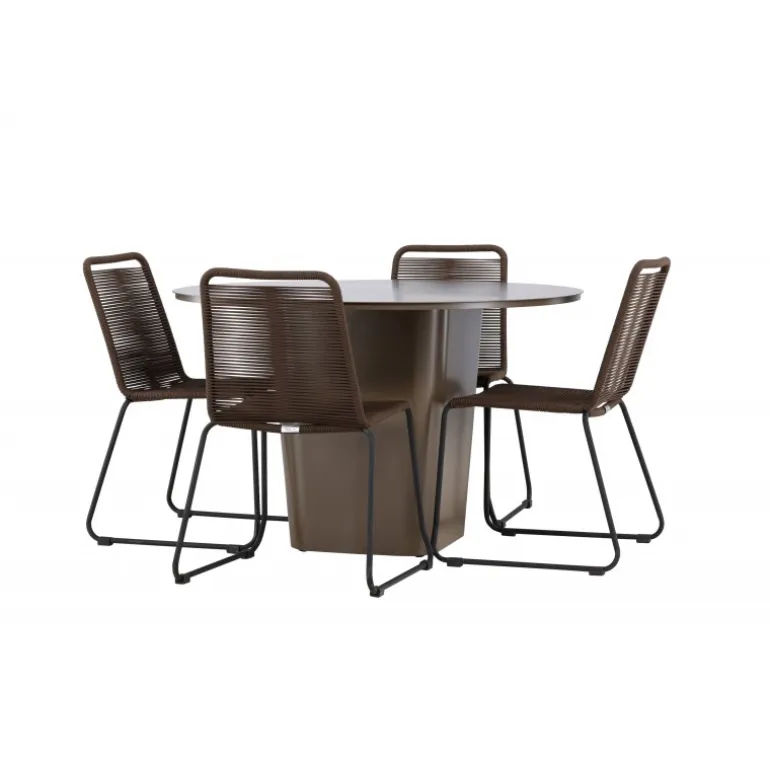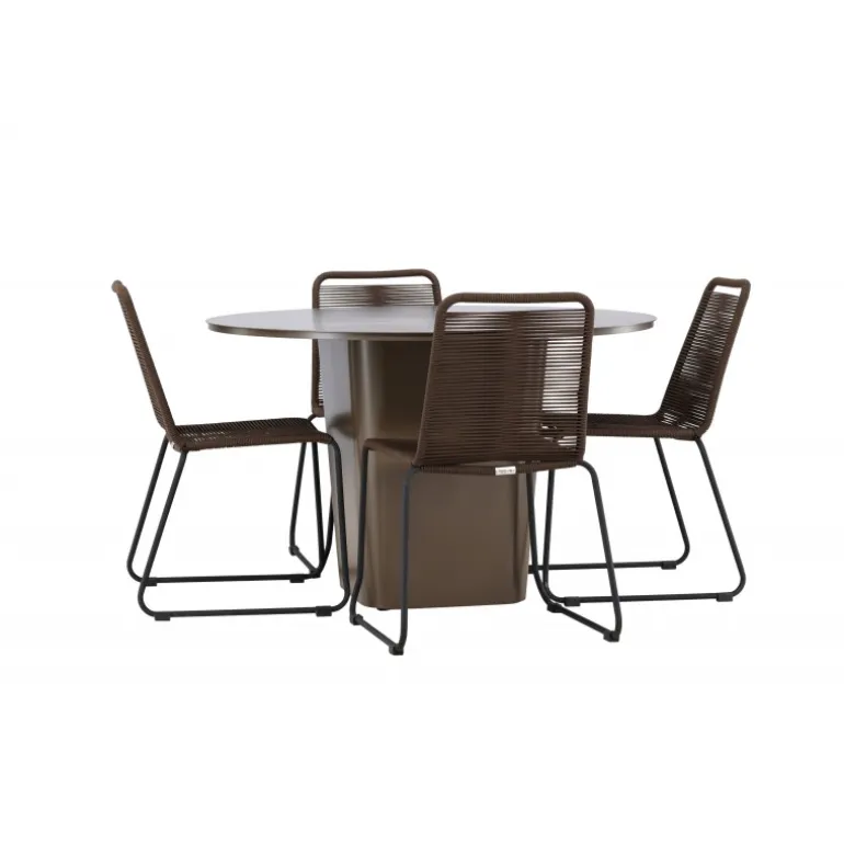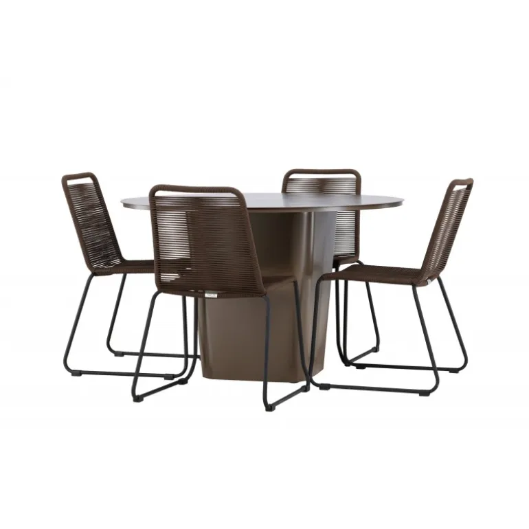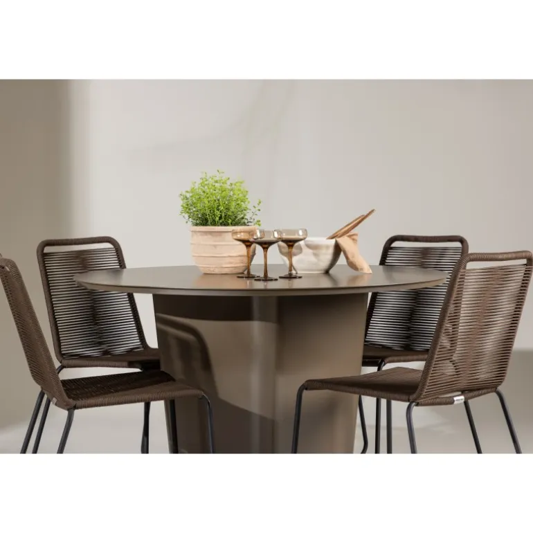 Oplev den perfekte blanding af stil og funktionalitet med vores nye Loungesæt – Havemøbelsæt – Lindos og Santa Fe. Denne elegant udformede ensemble er designet til at forbedre dine udendørsområder med et moderne design. Lindos stolene tilbyder en harmonisk fusion af komfort og æstetik. Deres sæder er fremstillet af robust brunt polypropylenmateriale, hvilket giver en naturlig, jordnær følelse. De sorte stålben giver en solid base, mens de bidrager til en moderne, minimalistisk stil. Santa Fe bordet fungerer som midtpunktet i dette Loungesæt – Havemøbelsæt med sit imponerende design og praktiske funktioner. Fremstillet af brunt aluminiumsmateriale kombinerer det holdbarhed med letvægtskonstruktion og nem vedligeholdelse. Med en diameter på 120 cm tilbyder det rigelig plads til familiemåltider eller afslappede sammenkomster med venner udendørs. Dette Loungesæt – Havemøbelsæt er ikke kun en praktisk investering for dit udendørsmiljø, men også en æstetisk tiltalende tilføjelse, der skaber en atmosfære af sofistikeret enkelhed. Med fire Lindos stole inkluderet er dette sæt ideelt til både små og større udendørsområder.