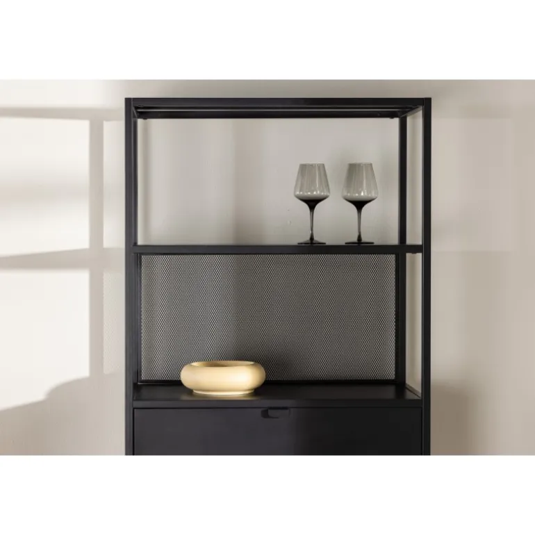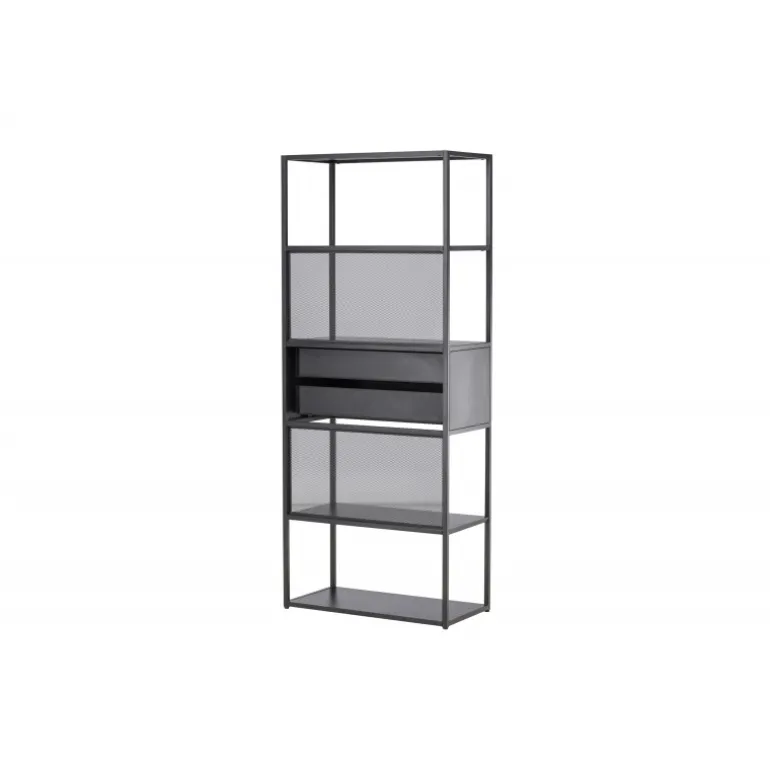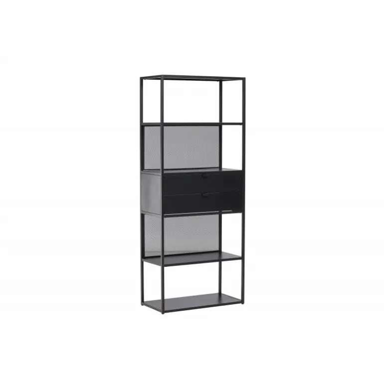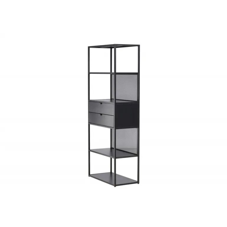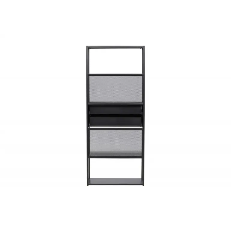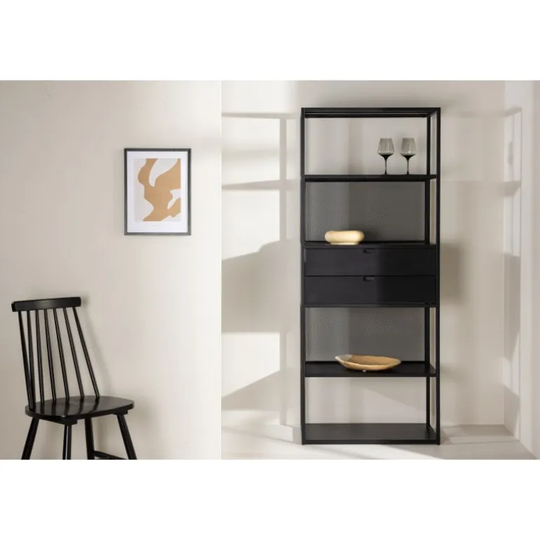 Indret dit hjem klogt med en praktisk opbevaringshylde i sort stål fra Santiago-serien! Med fire åbne hylder kan du nemt dekorere og organisere din hylde på en personlig og stilfuld måde. Pynt den med smukke lysestager, vaser, planter og bøger for et hyggeligt hjemligt look. Men det er ikke alt – to praktiske skuffer i midten giver dig mulighed for at gemme mindre hyppigt brugte genstande og opretholde orden og ryddelighed i huset. Fremstillet af robust sort stål, er Santiago klar til at bære dine yndlingsting med lethed. Dens robuste konstruktion sikrer langvarig holdbarhed og sikkerhed for dine ejendele. Men selvfølgelig er det mere end bare en hylde; det er et personligt præg til din indretning. Dens slanke og minimalistiske design passer ind i hvert rum, fra stuen til soveværelset, og skaber en harmonisk atmosfære. Lad Santiago hjælpe dig med at organisere din plads. Gør livet lettere ved at holde alle dine ting pænt arrangeret, samtidig med at du tilføjer et sofistikeret og hjemligt præg til dit rum. Her mødes form og funktion på den bedst mulige måde!