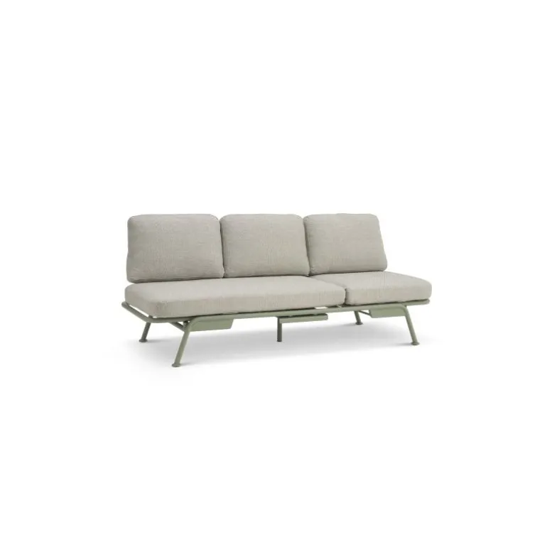 Du har flere anvendelsesmuligheder med den. Den kan stå som en tre pers sofa, du kan hæve det ene siddestykke, så det bliver til en daybed og du kan ombygge den ved at skubbe ryg-stellet ind under, så det bliver til en solseng. Derudover er der en hylde / bordplade som kan hives ud og vupti, der kan glas, telefon og briller ligge på.