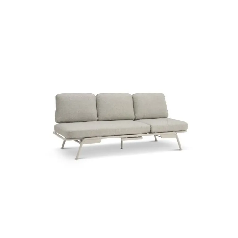 Du har flere anvendelsesmuligheder med den. Den kan stå som en tre pers sofa, du kan hæve det ene siddestykke, så det bliver til en daybed og du kan ombygge den ved at skubbe ryg-stellet ind under, så det bliver til en solseng. Derudover er der en hylde / bordplade som kan hives ud og vupti, der kan glas, telefon og briller ligge på.