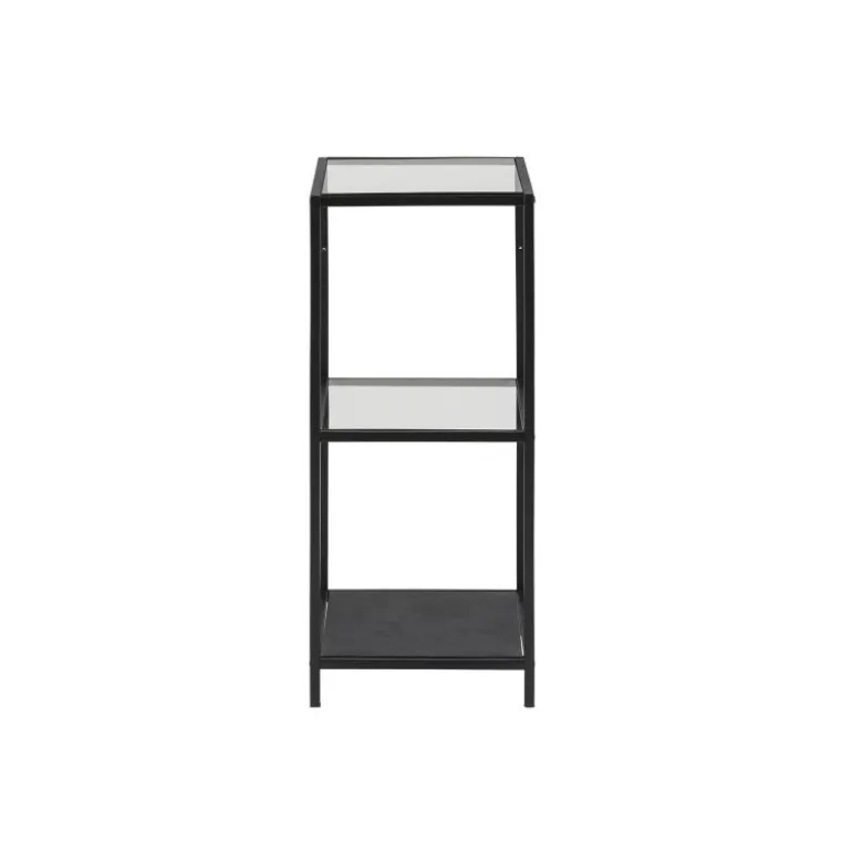 Flot reol med glashylder og slankt sortmalet metalstel i lækker nordisk stil, hvor stilren æstetik og funktionalitet kombineres på bedste vis. En moderne og funktionel reol med mange anvendelsesmuligheder. Udover i stuen kan reolen også med fordel benyttes til opbevaring i badeværelset eller køkkenet.