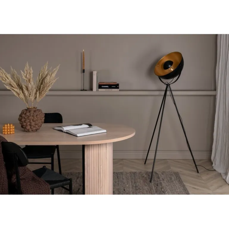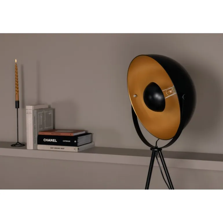 Search er gulvlampen, der tager sig af det hele! En selvsikker lampe i sort med gulddetaljer. Med de lette ben på lampen bliver den stilfuld og en perfekt gulvlampe til dem, der ønsker noget ekstra!