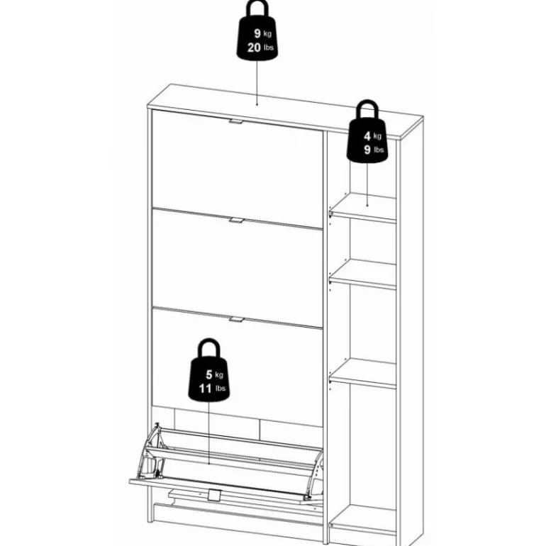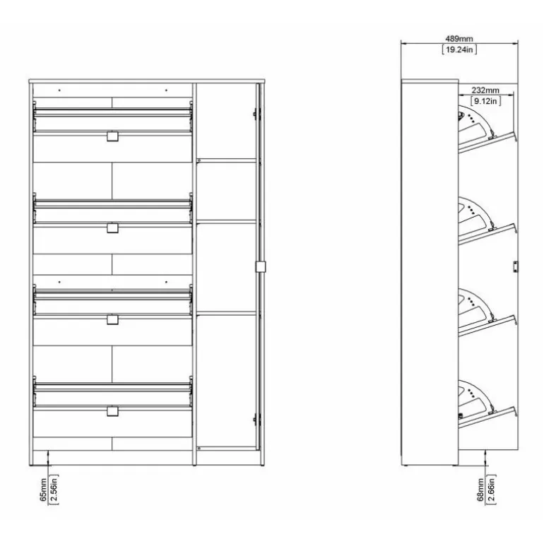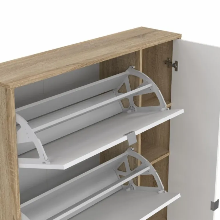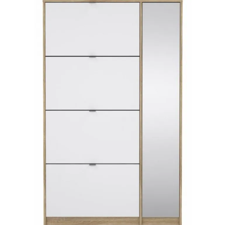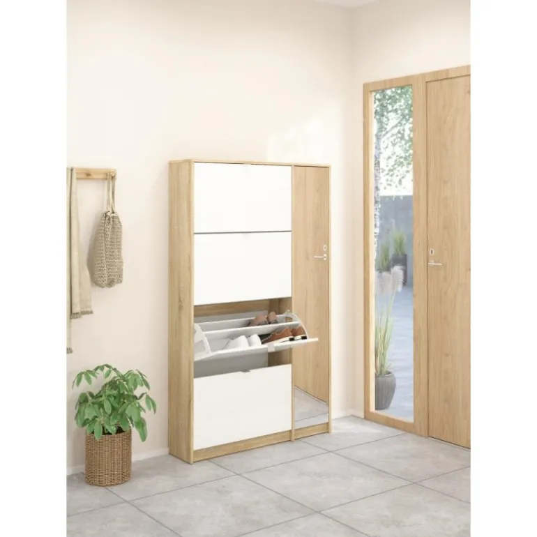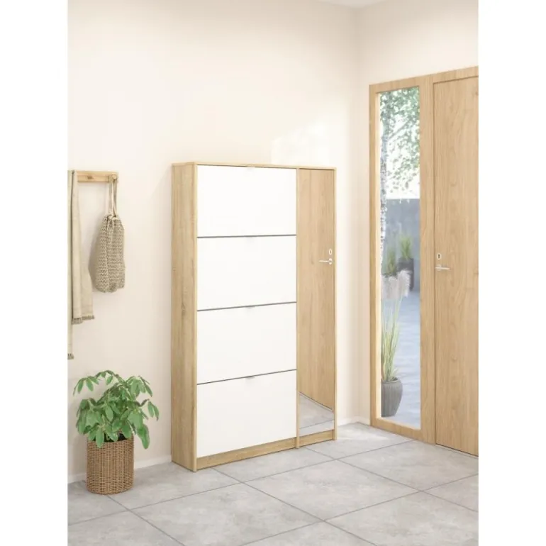 Dette Shoes Skoskab er det perfekte tilbehør til dit hjem. Med 4 klaplåger og 2 rum, kan du nemt organisere og opbevare dine sko. Den ene låge er endda et spejl, så du kan tjekke dit outfit, inden du går ud af døren. Skoskabet er lavet af spånplade og har en flot eg struktur og hvid højglans finish. Få styr på dine sko og gør dit hjem mere stilfuldt med dette praktiske og elegante skoskab.
