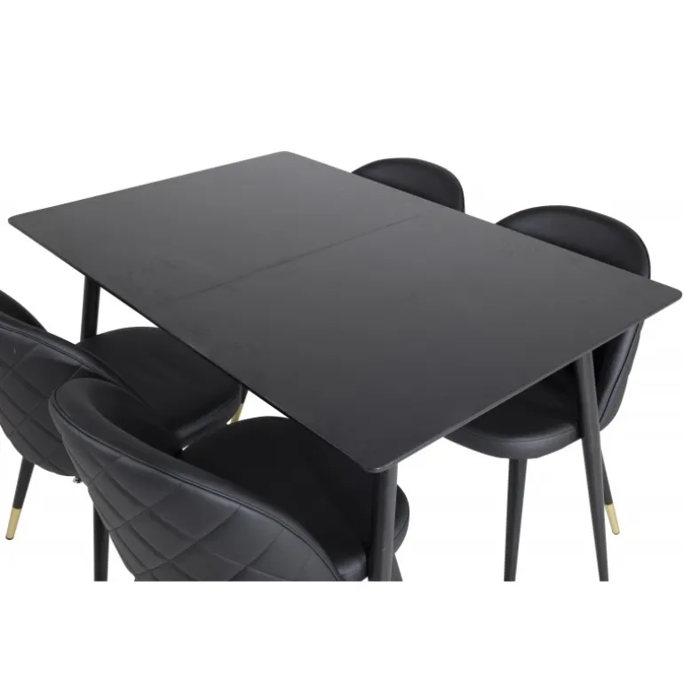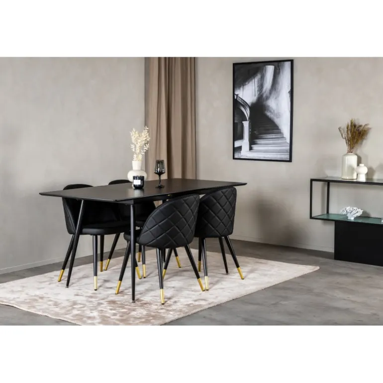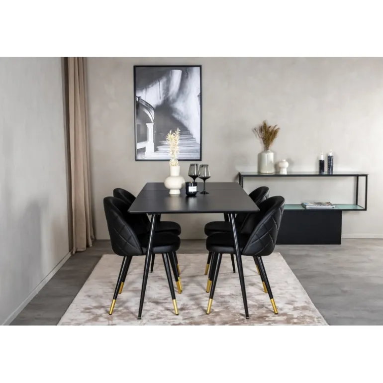 Oplev en moderne og hyggelig spiseoplevelse med Silar Rektangulær Spisebordssæt. Dette sæt kombinerer en stilfuld spisebord i sort MDF med luksuriøse velourstole, som har elegante gulddetaljer ved bunden. Stolene er robuste og komfortable, hvilket gør dem ideelle til lange middage med gode venner. Med sit elegante design og kvalitetsmaterialer bliver dette sæt midtpunktet i dit spiseområde.