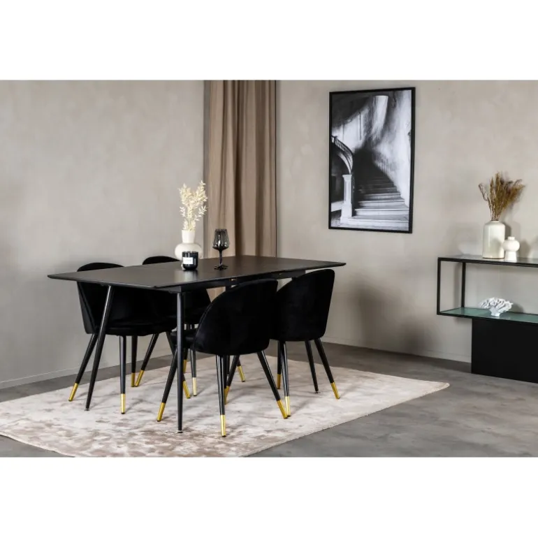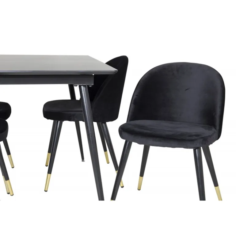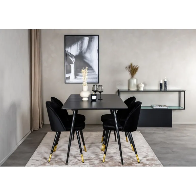 Vores stilfulde sorte spisebordsstole i velour fra Velvet-serien kombineret med spisebordet Sinar passer ind i de fleste husholdninger. Et bord med masser af plads til middage og socialt samvær. Indret dit hjem med et strejf af luksus – det skal føles rart at komme hjem!