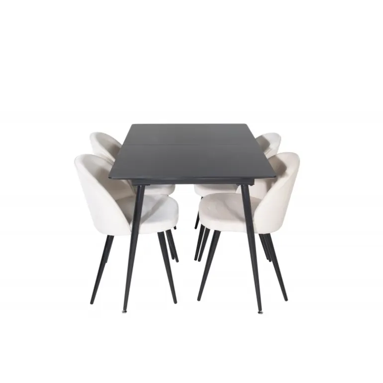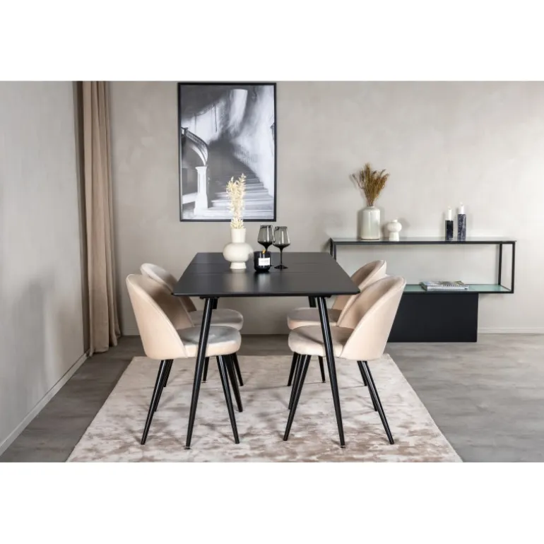 Vores moderne spisebord er kombineret med delikate beige spisestole fra Velvet-serien. Her får du en madgruppe, der direkte indgyder luksus og elegance. “Klæd din madgruppe op eller ned” med anden indretning omkring, lige så godt til hverdag som til fest!