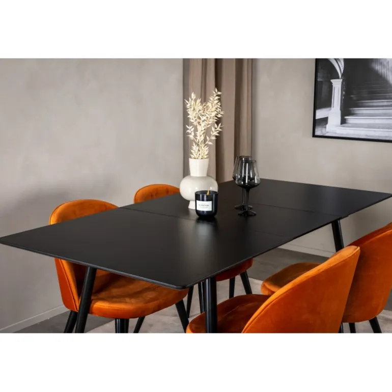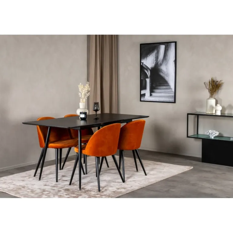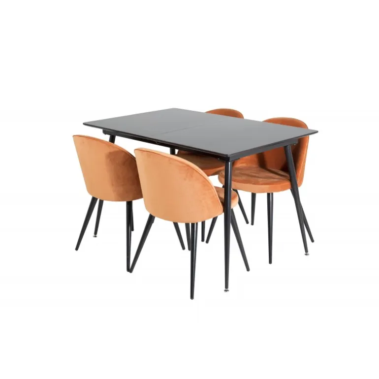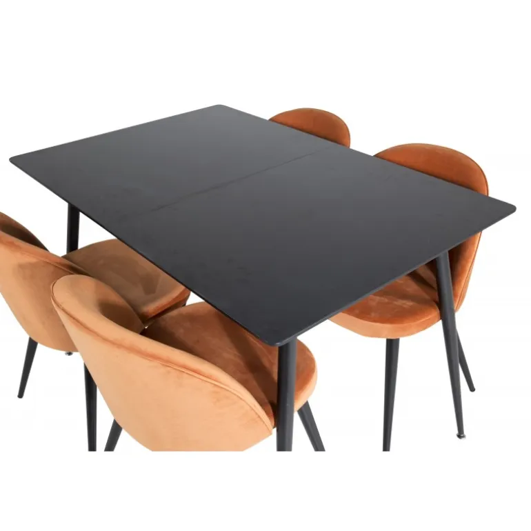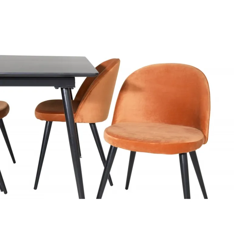 Gør dit hjem mere elegant og funktionelt med Silar Rektangulært Spisebordssæt. Dette moderne og stilfulde Spisebordssæt inkluderer et robust bord med en MDF bordplade og fire komfortable stole i velour. Den sorte bordplade og de rustorange stole tilføjer et sofistikeret touch til din indretning. Uanset om du inviterer til middagsselskab eller bare nyder en familieaften, passer dette sæt perfekt til dine behov. Silar Spisebordssæt er det ideelle valg for dem, der søger både stil og funktionalitet i deres hjem.