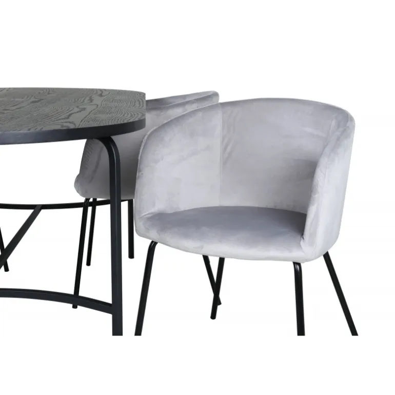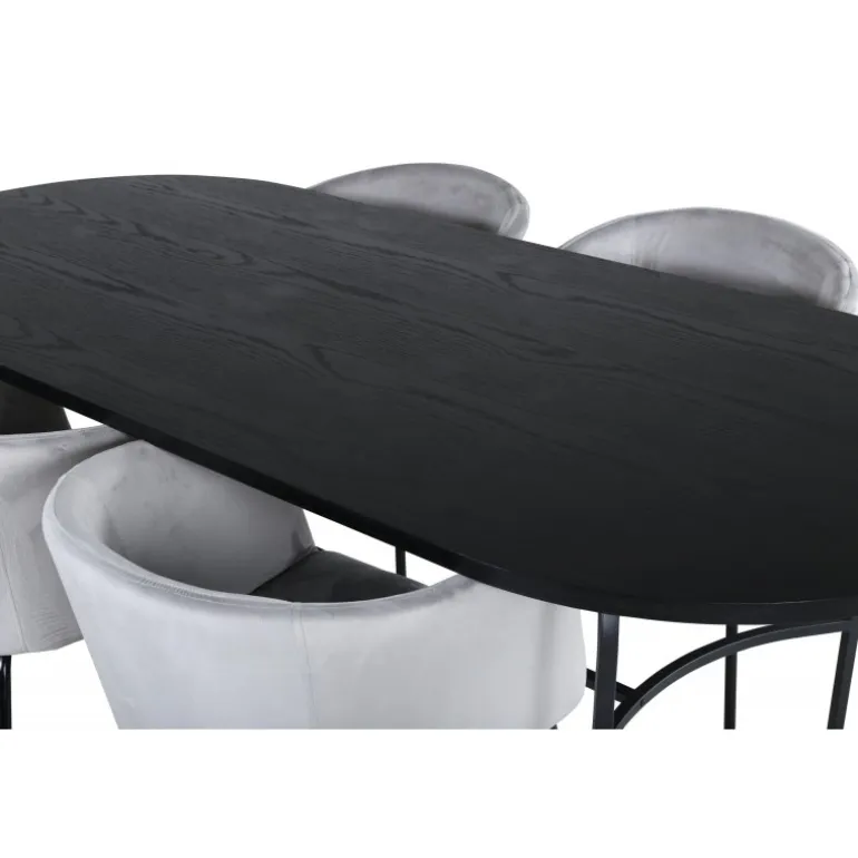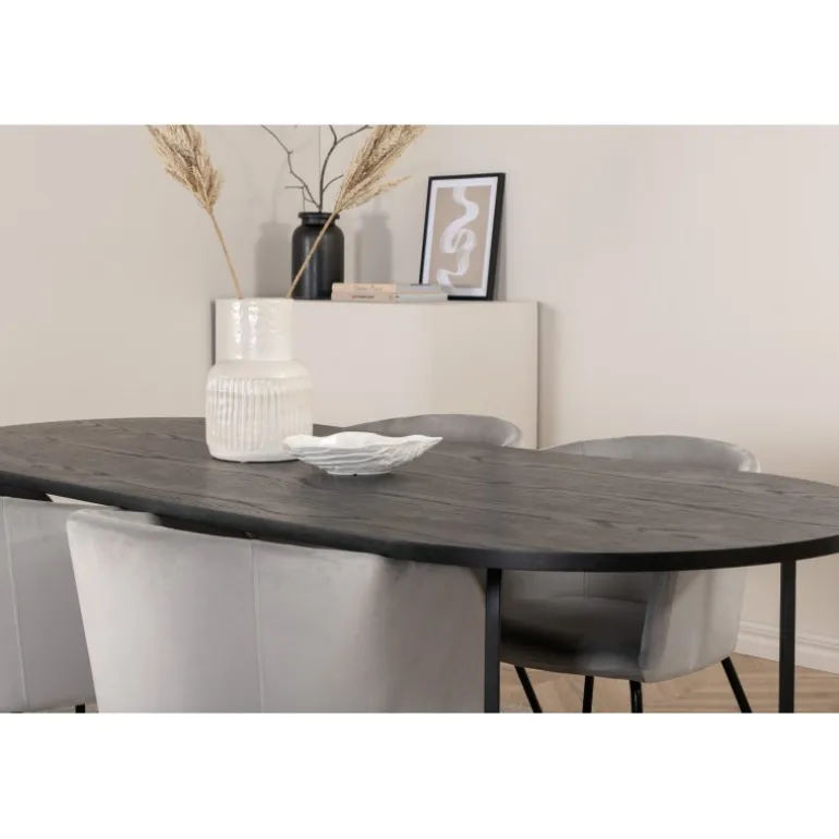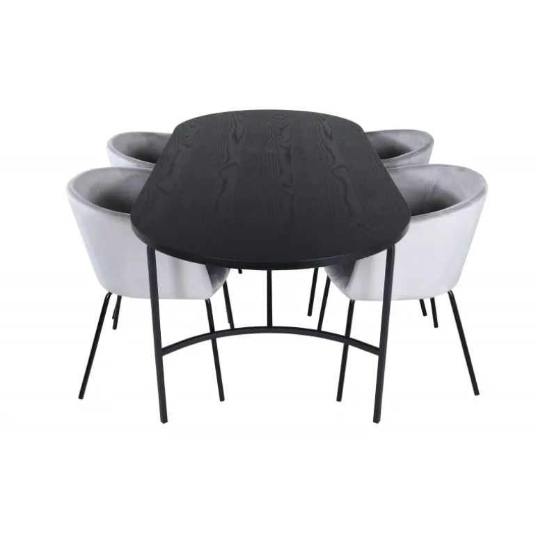 Pompøst og elegant – et madgruppe, der fokuserer på komfort og minimalisme! Vores populære spisebordsstole Berit er en favorit i mange husholdninger. De har et indbydende design og en behagelig grå farve, der er utrolig tiltalende. Sædet er i fløjlsstof, og stolens ben er stilfuldt smalle i sort jern. Stolens dimensioner: Højde: 78 cm, siddehøjde: 49 cm, bredde: 55 cm, dybde: 55 cm. Her matches 4 spisebordsstole med vores ovale spisebord skate. Bordets samlede design er meget gennemtænkt med en tynd topplade i sort MDF med finer og sorte bordben i metal. Bordets dimensioner: Længde: 200 cm, Bredde: 90 cm, Højde: 75 cm.