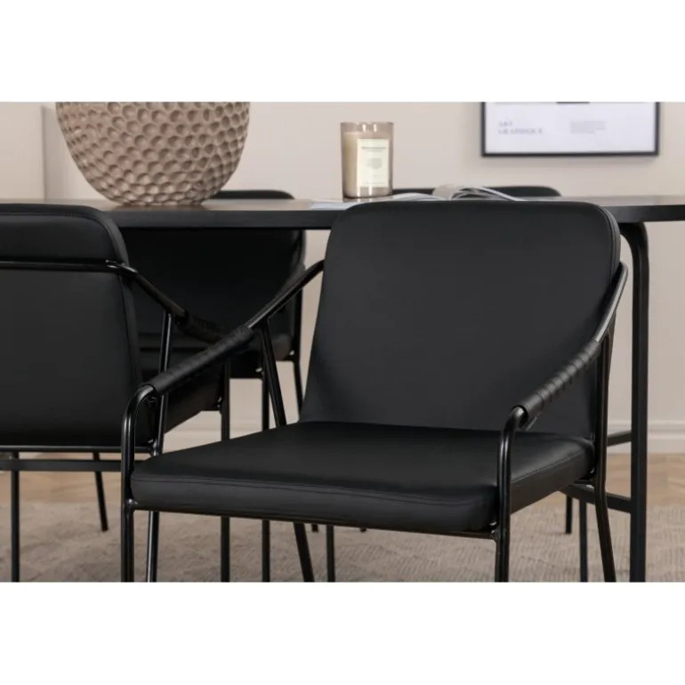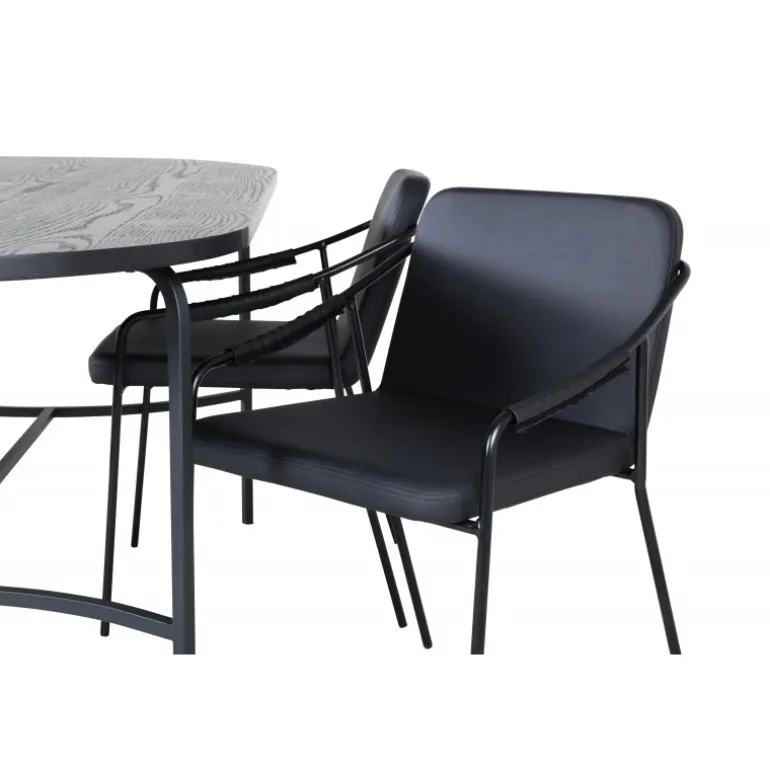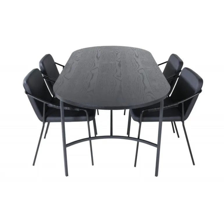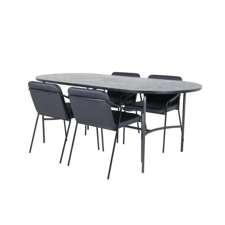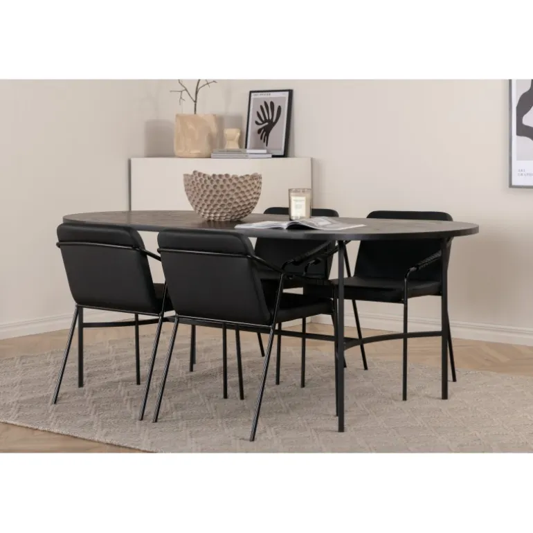 Indret stuen hyggeligt og trendsikkert! Spisebordet Skate imponerer med sit elegante og indbydende, ovale design. Den samlede udformning er meget gennemtænkt med en tynd bordplade i sort MDF med finer og sorte bordben i metal. Bordets dimensioner: Længde: 200 cm, Bredde: 90 cm, Højde: 75 cm. Her sammen med 4 Tvist spisebordsstole i slankt design. Sæderne er i sort kunstlæder og har integrerede armlæn samt stoleben i sort jern. Stolens dimensioner: Højde: 77 cm, sædehøjde: 48 cm, bredde: 53 cm, dybde: 59 cm. En luksuriøs og stilfuld Spisebordssæt, der inviterer til lange middagssessioner!