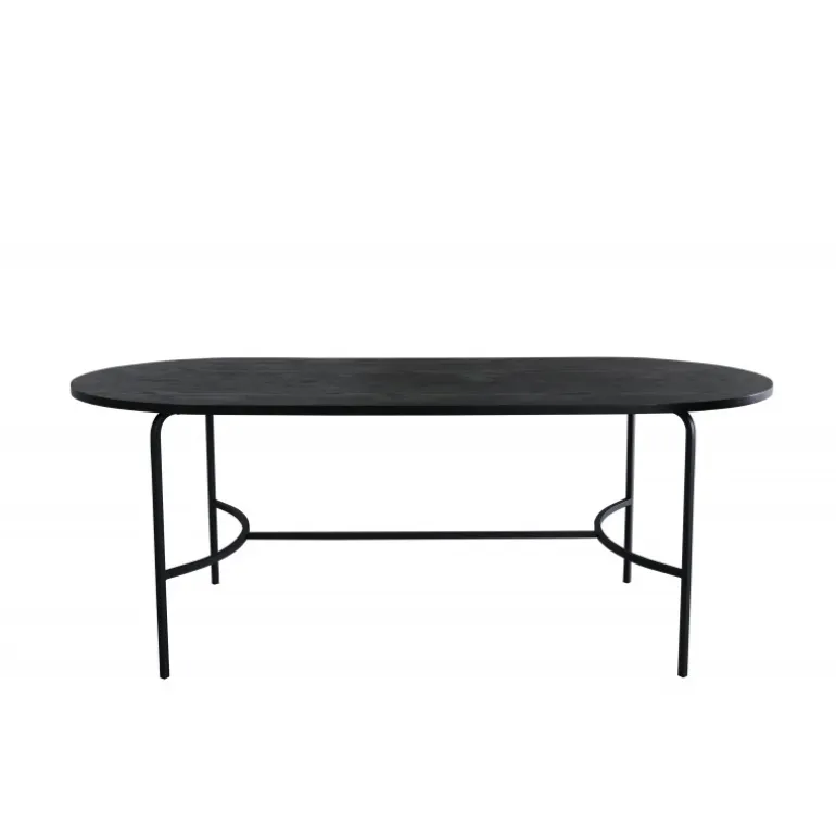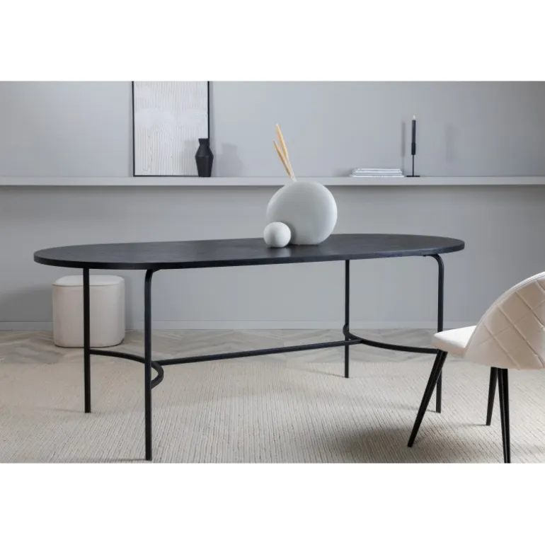 Forny dit hjem med et charmerende, stilfuldt og indbydende spisebord fra Skate-serien! Dette ovale bord har et elegant design med en tynd bordplade og en flot designet understel i samme stil. Ovalt spisebordpladen er lavet af MDF i en tidløs sort farve. Det smalle og dekorative understel er i sort pulverlakeret metal. Match med et par komfortable spisebordsstole og nyd et hyggeligt møbel, hvor ingen ender på kanten! Plejeråd: MDF-plader, der er malet eller lakeret, er følsomme over for ridser og skader. Vær derfor forsigtig med pladerne for at undgå dette. Overflader malet med lak med farvepigment eller maling har en pigmentering, der giver en ikke-dækkende transparent overflade.
