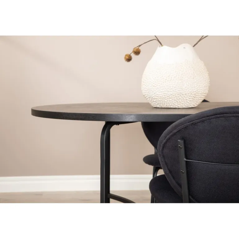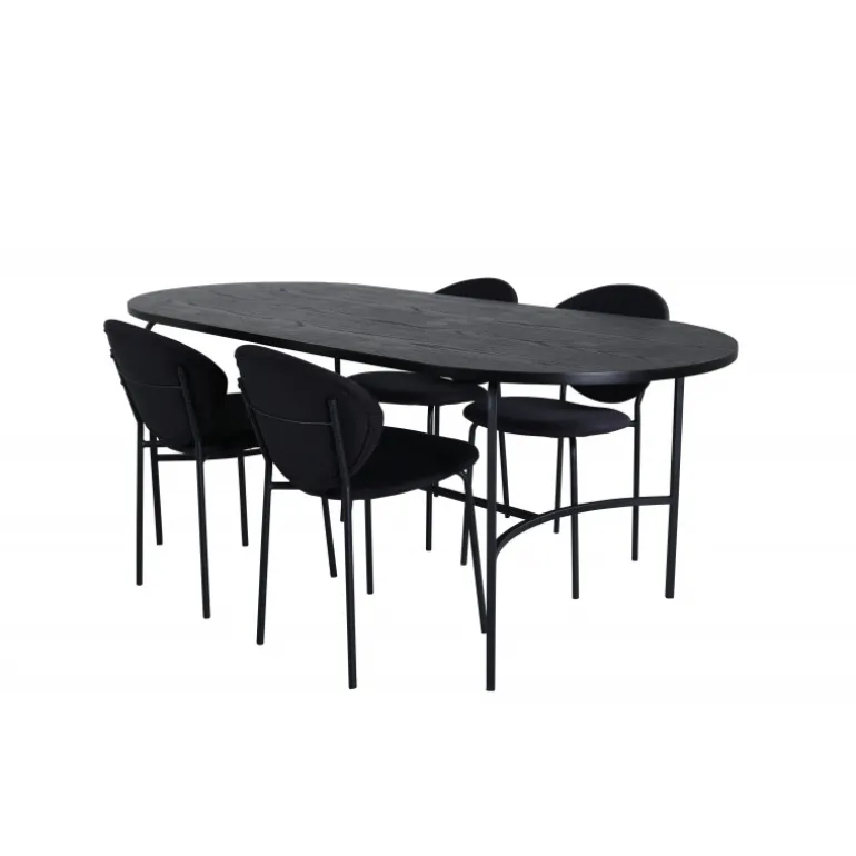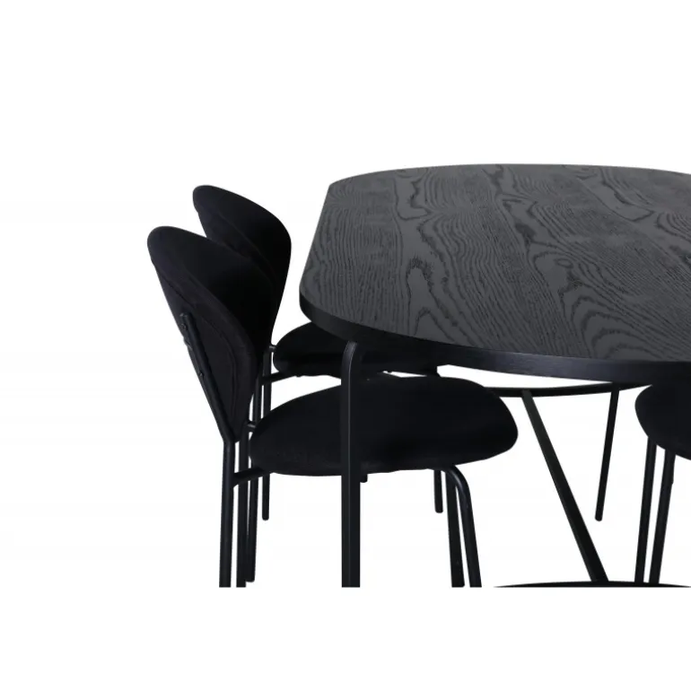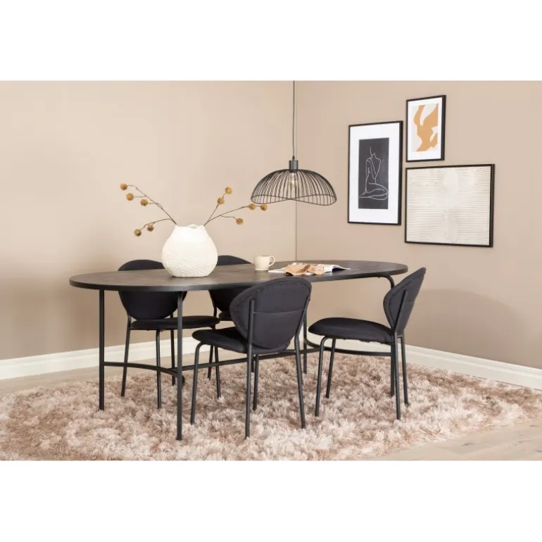 Lad dette smukt matchede Spisebordssæt med en moderne følelse blive et naturligt samlingspunkt i dit hjem. Spisebordet Skate imponerer med sit elegante design og indbydende, ovale form. Det samlede design er meget gennemtænkt med en tynd bordplade i sort MDF med finer og sorte bordben i metal. Bordets dimensioner: Længde: 200 cm, Bredde: 90 cm, Højde: 75 cm. Matchet her med 4 Vault spisestole i et smukt design. Sædet er let afrundet i sort polyesterstof og stolens ben er stilfuldt smalle i sort metal. Stolens dimensioner: Højde: 80 cm, sædehøjde: 49 cm, bredde: 46 cm, dybde: 61,5 cm.