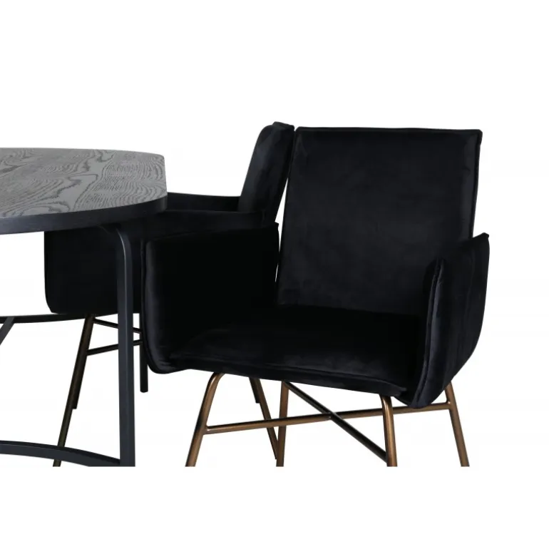 - Komfortable stole: Petra stole med kobberfarvede ben og sort velourstof for maksimal komfort.