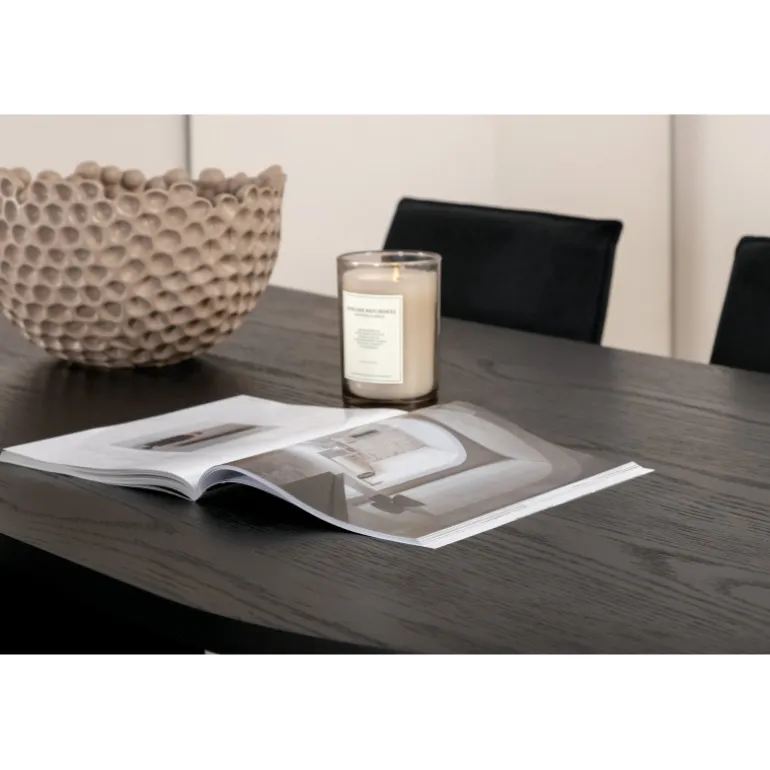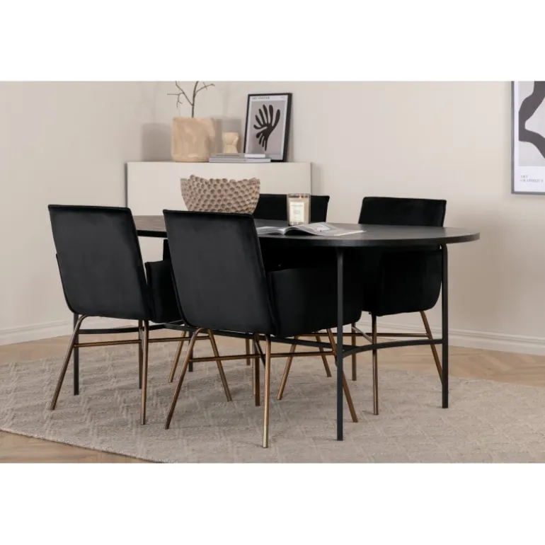 Lad dette smukt afstemte Spisebordssæt med en moderne følelse blive et naturligt samlingspunkt i dit hjem. Spisebordet Skate imponerer med sit elegante design og indbydende, ovale form. Det overordnede design er meget velgennemtænkt med en tynd topplade i sort MDF med finer og sorte bordben i metal. Bordets dimensioner: Længde: 200cm, Bredde: 90cm, Højde: 75cm. Matchet her med 4 Petra spisestuestole i komfortabelt design. Stolebenene er i kobberfarvet jern, og sæderne er indbydende i sort velourstof. Stolens dimensioner: Højde: 87cm, sædehøjde: 48cm, bredde: 57cm, dybde: 60cm.