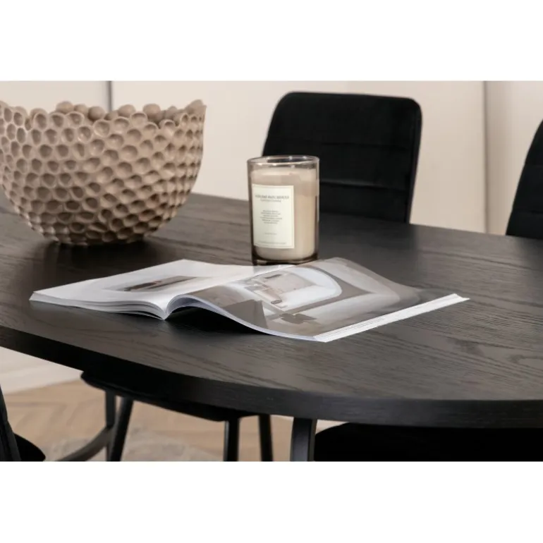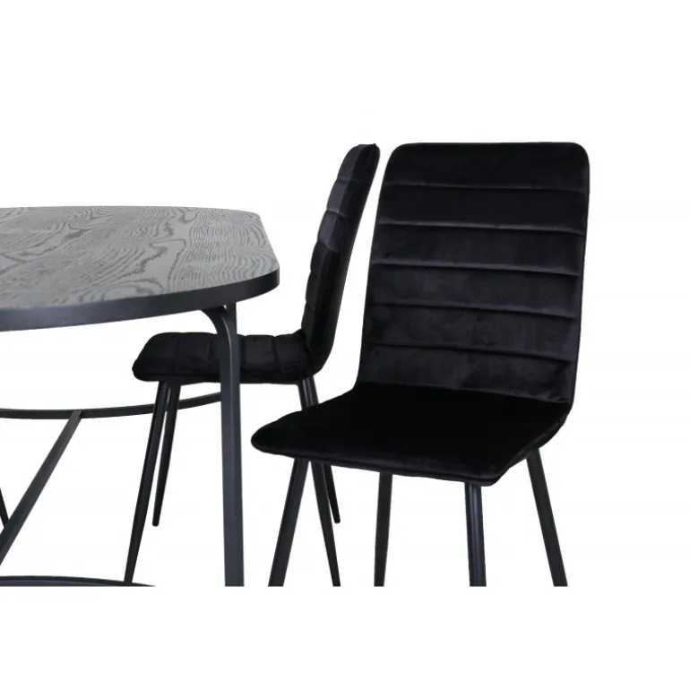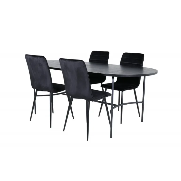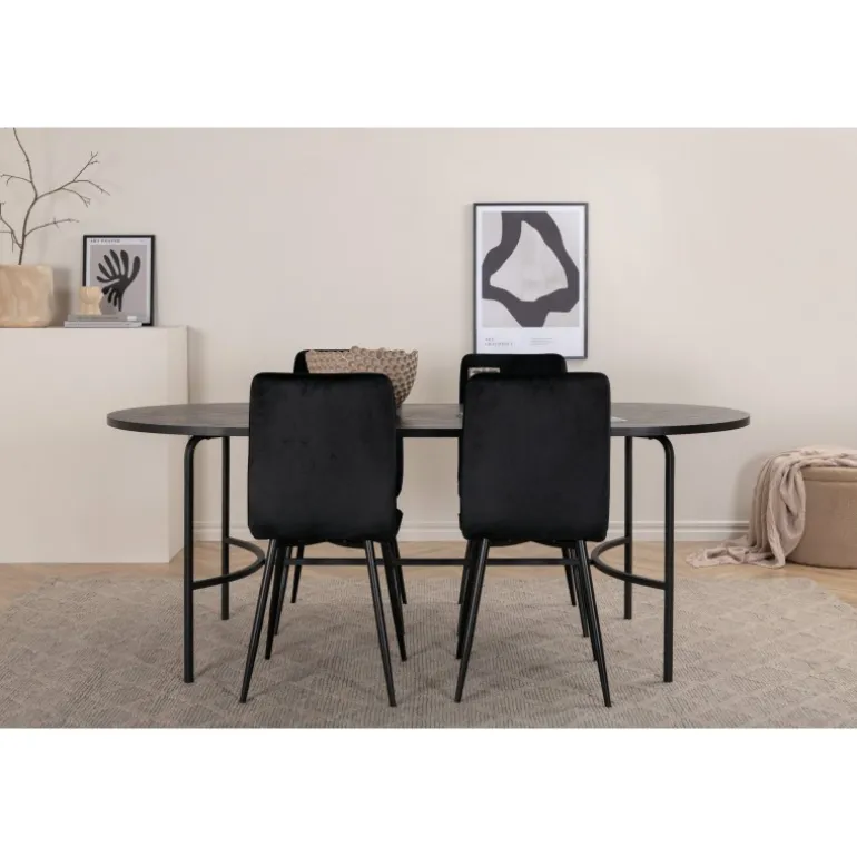 Oplev komfort og stil med Skate Ovalt spisebordssæt! Dette elegante sæt inkluderer et spisebord med en slank bordplade i sort MDF med finer og sorte metalben. Bordet er designet med en indbydende, oval form, der passer perfekt til ethvert moderne hjem. Bordets dimensioner er: Længde: 200 cm, Bredde: 90 cm, Højde: 75 cm. Til dette sæt medfølger fire luksuriøse Windu spisebordsstole i en lige form og moderne design. Stolens ben er i sort jern, og sædet er beklædt med indbydende sort fløjlstof. Stolens dimensioner er: Højde: 94 cm, Sædehøjde: 47 cm, Bredde: 43 cm, Dybde: 49 cm. Nyd hyggelige måltider fremover med dette smukke og funktionelle Spisebordssæt!