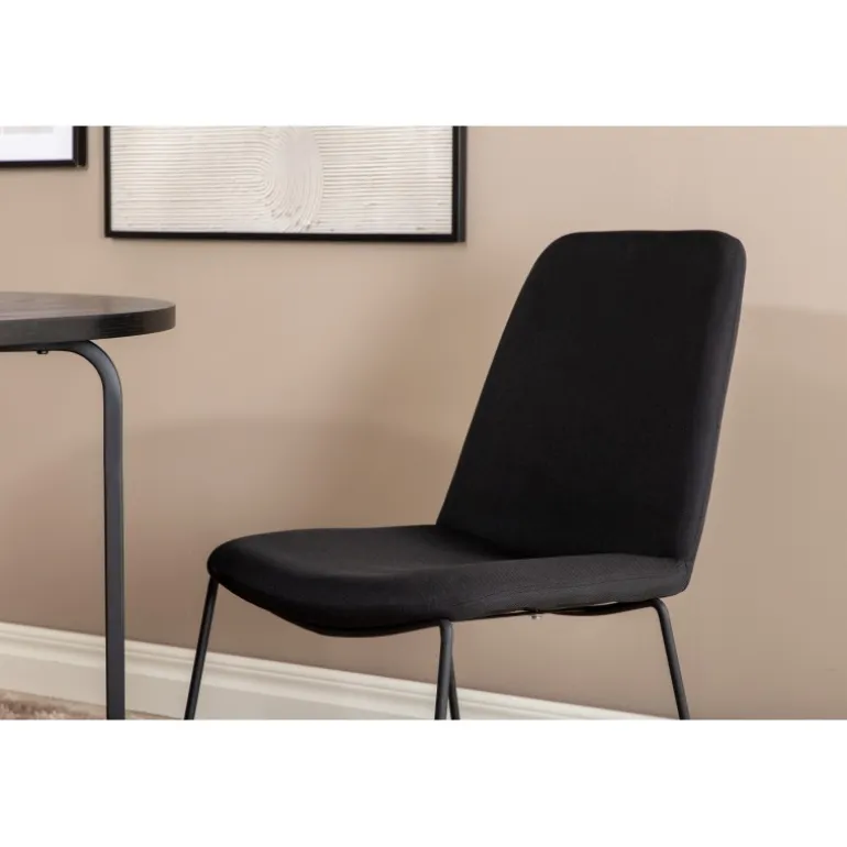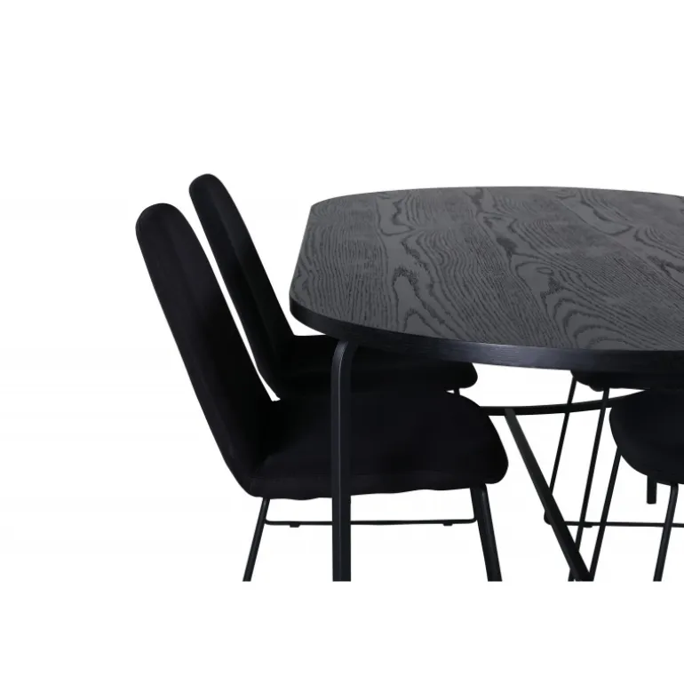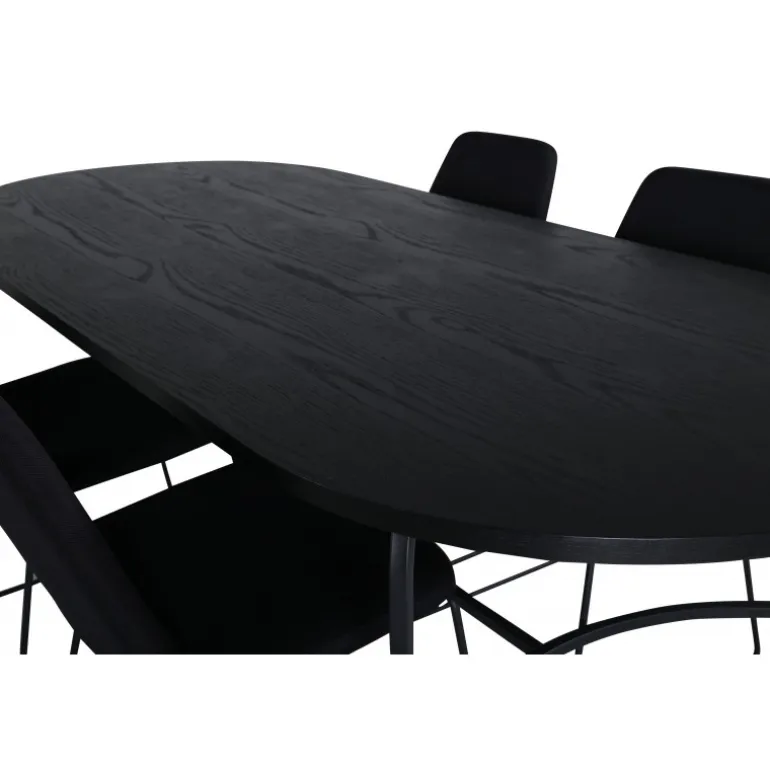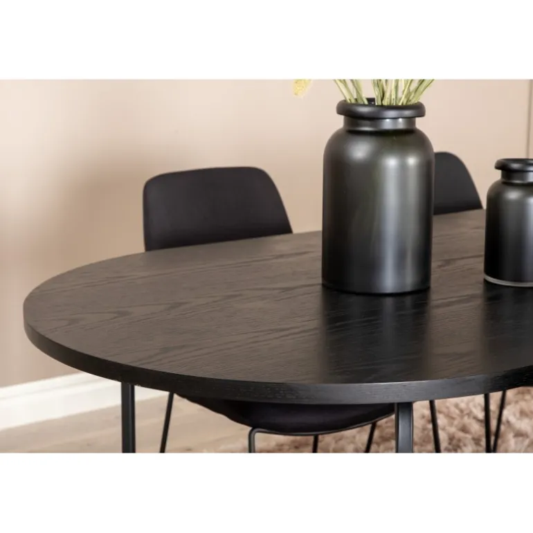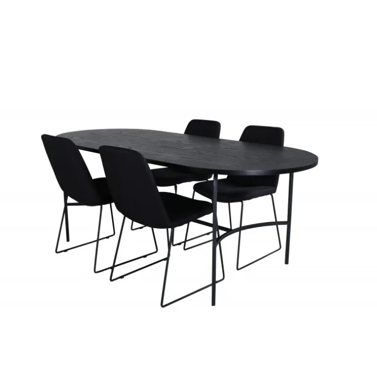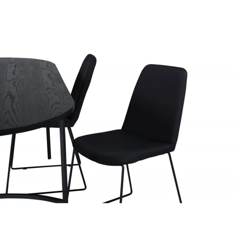 Skate Ovalt Spisebordssæt er perfekt til dem, der søger komfort og stil. Dette spisebord imponerer med sin elegante og indbydende, ovale form. Designet er gennemtænkt med en slank topplade i sort MDF med finer og sorte metalben. Bordets dimensioner: Længde: 200 cm, Bredde: 90 cm, Højde: 75 cm. Sættet inkluderer fire Muce spisebordsstole, der udstråler minimalisme og moderne design. Sædet er lavet af polyester, mens de smalle ben i jern giver et luftigt indtryk i rummet. Stolenes dimensioner: Højde: 84 cm, Sædehøjde: 47 cm, Bredde: 43 cm, Dybde: 63 cm.