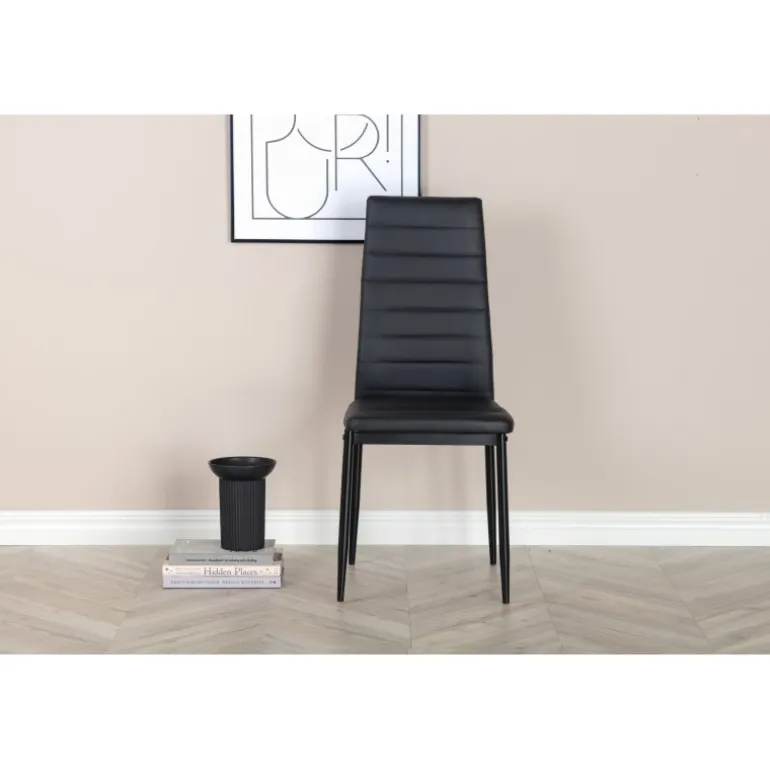 Spisebordsstol Slank har en høj ryg i et fuldt klædt moderne design. Ryg og sæde er i sort kunstlæder med dekorative syninger på indersiden, der danner et stribet mønster, med polstring. Benene er i sort pulverlakeret metal. Her kan du og dine gæster sidde komfortabelt i timevis! Lettere samling kræves. Plejeråd: Ved kraftige pletter anvendes en fugtet bomuldsklud og et middel beregnet til rengøring af bycast & PU. Prøv først på et ikke-synligt område, da nogle midler kan have forskellige sammensætninger.