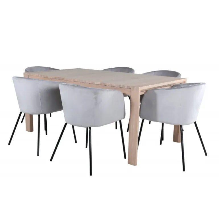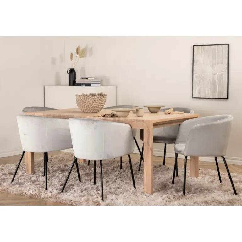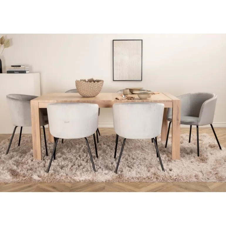Vores populære spisebordsstole Berit i luksuriøst design forlænger de behagelige middagstunder! Stolen har en generøs sædedybde med et sæde i lysgrå fløjl og stilfulde smalle stoleben i sort jern. Stoledimensioner: Højde: 78 cm, sædehøjde: 49 cm, bredde: 55 cm, dybde: 55 cm. Her matches 6 spisebordsstole med Slider, et udtrækkeligt spisebord i neutral design, der nemt passer ind i de fleste indretningsstile. Bordpladen er knoglehvid i egefiner med spånplade og bordben i eg. Borddimensioner: Længde udtrækkelig mellem: 170 cm og 250 cm, bredde: 95 cm, højde: 75 cm.