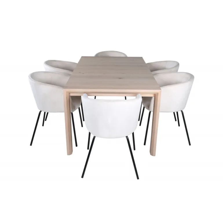 Slider er et stilfuldt og udtrækkeligt spisebord i et lyst egetræslook, der er garanteret at blive en succes både til hverdag og til festmiddage! Det lige nordiske design skaber et elegant blikfang i dit hjem. Bordpladen er i knoglehvid egetræsfinér med spånplade og bordbenene i eg. Bordets dimensioner: længde kan udtrækkes mellem 170 cm og 250 cm, bredde: 95 cm, højde: 75 cm. Matchet her med 6 Berit spisestole i luksuriøst design! Stolene har en behagelig sæde i beige fløjl og stilfulde smalle ben i jern. Stolens dimensioner: højde: 78 cm, sædehøjde: 49 cm, bredde: 55 cm, dybde: 55 cm.
