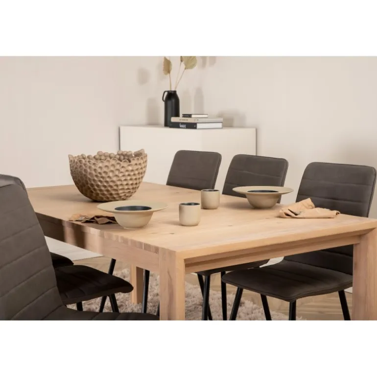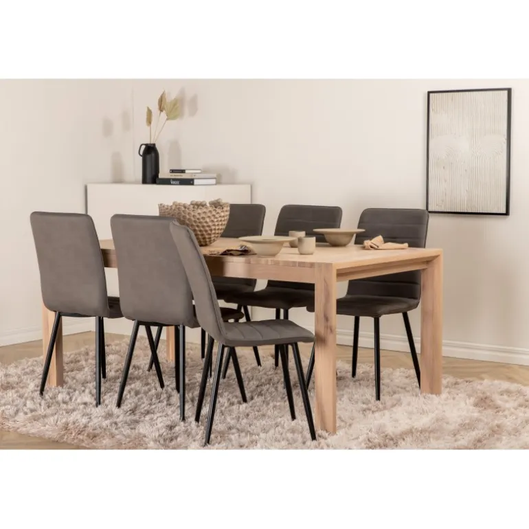 Ingen grund til at gå på kompromis mellem stil og komfort! Vores populære spisebordsstole Windu Luxury i et lige design skaber en behagelig blikfang midt i hjemmet. Stolens ben er i jern, og sæderne er i grå mikrofiber. Stolens dimensioner: Højde: 94 cm, sædehøjde: 47 cm, bredde: 43 cm, dybde: 49 cm. Her matches 6 spisebordsstole med Slider, et udtrækkeligt spisebord i et neutralt design, der let passer ind i de fleste interiørstile. Bordpladen er benhvid i egetræsfiner med spånplade og bordben i eg. Bordets dimensioner: Længde udtrækkelig mellem: 170 cm og 250 cm, bredde: 95 cm, højde: 75 cm.