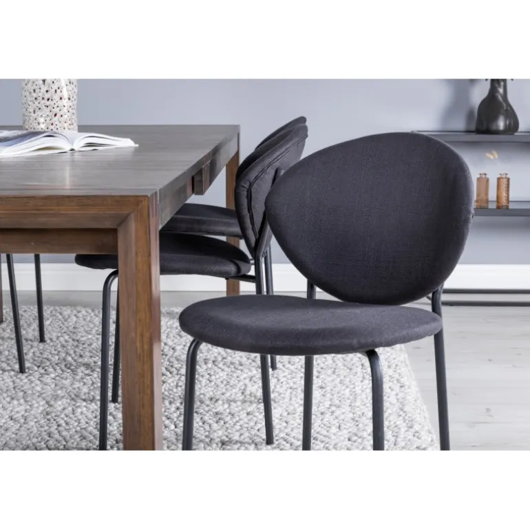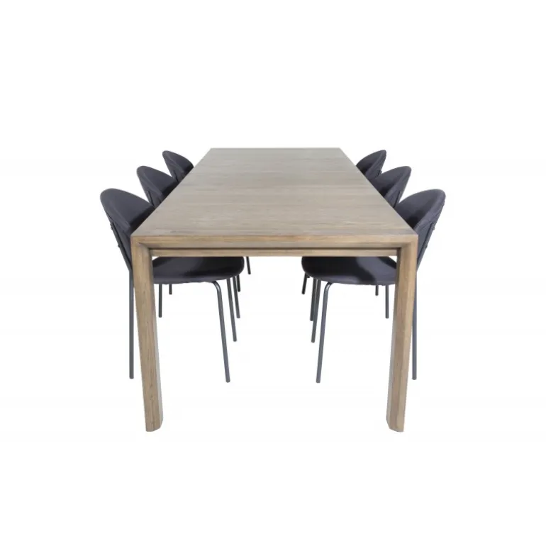 - Elegant Design: Egetræsbord med sortpolstrede stole.