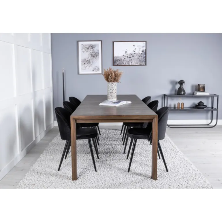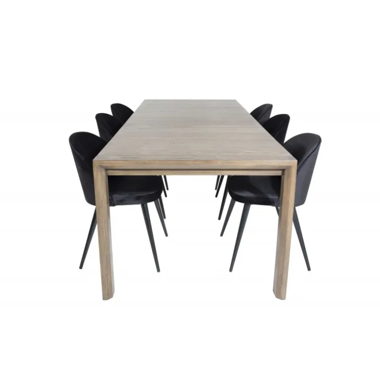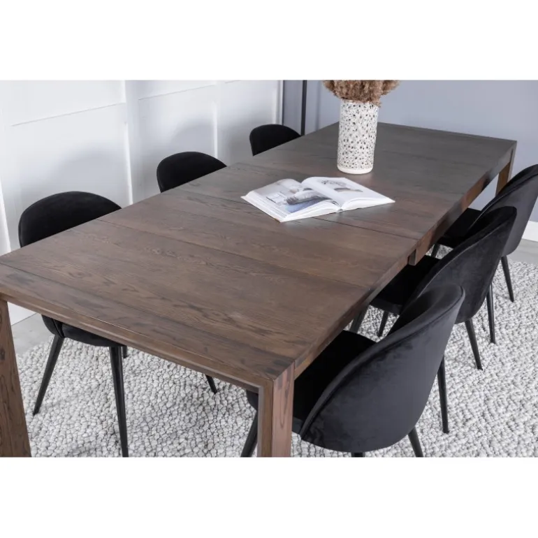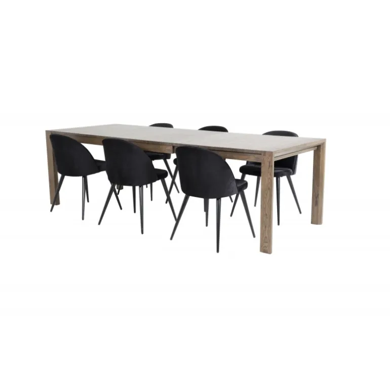 Velkommen til Slider Rektangulært Spisestuesæt! Dette elegante sæt kombinerer vores komfortable velour-spisestole med et stilfuldt spisebord i egelook med udvidelsesmuligheder. Perfekt til både små og store sammenkomster, sætter dette spisebordssæt en ny standard for spisestueindretning. Med materialer som bøjetræ, fibre, skum, polyester velour og stål, er dette sæt både holdbart og æstetisk tiltalende. Fås i farverne sort og natur, dette sæt passer perfekt ind i enhver moderne indretning.