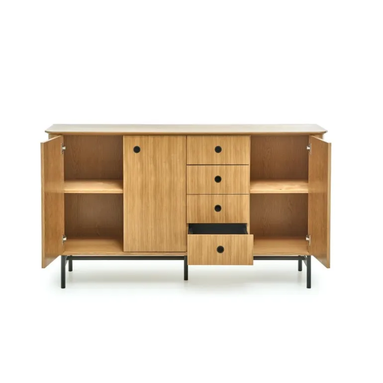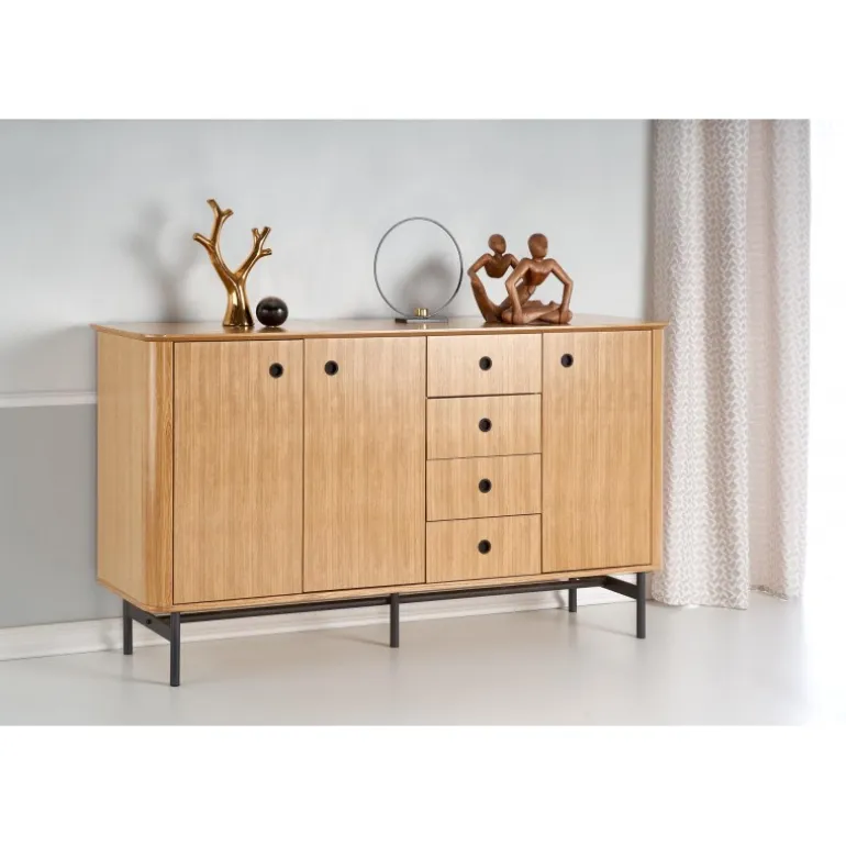 Oplev SMART KM-1 kommode med en elegant kombination af natur eg og Sort. Denne stilfulde kommode er fremstillet af MDF med naturlig egetræsfinér og spånplade med naturlig egetræsfinér, hvilket sikrer holdbarhed og et tidløst design. Med dimensionerne 167/44/93 cm passer denne kommode perfekt ind i ethvert rum, og dens rummelige opbevaringsmuligheder gør den til en ideel løsning til din bolig. Det pulverlakerede stål giver en moderne finish, der komplementerer det naturlige træ perfekt.