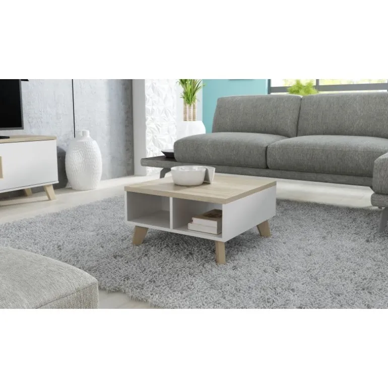 Oplev elegance og funktionalitet med vores Sofabord 60 LOTTA i diamant hvid og sonoma eg. Dette stilfulde sofabord er designet til at passe perfekt ind i enhver moderne stue. Med dimensioner på Højde: 35 cm, Bredde: 60 cm, Dybde: 60 cm og en benhøjde på 15 cm, tilbyder det både praktisk opbevaringsplads og en æstetisk appel. Bordets krop og top er fremstillet af mat spånplade på henholdsvis 16 mm og 25 mm, mens håndtag og ben er lavet af bejdset træ, hvilket sikrer holdbarhed og stabilitet.