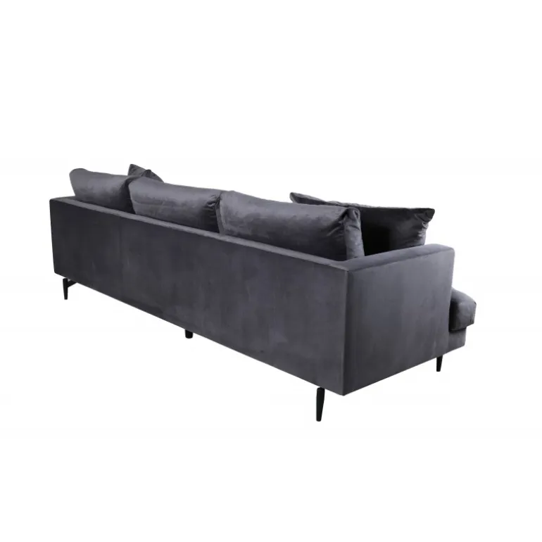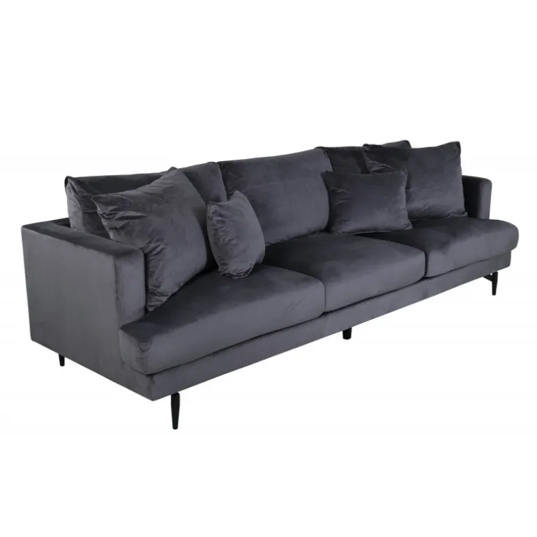 En mørkegrå, velour sofa-drøm, der udstråler luksus og stil! Sofia sofa-serien kombinerer elegant design med en lige, nordisk stil og en charmerende fremtoning, der skaber en indbydende blikfanger. De smalle ben i metal giver denne 3 personers sofa et smart og dekorativt løft, der gør det nemt at støvsuge under den. Giv dig tid til afslapning – hyg dig med familien eller bred dig ud alene! Sofaens dimensioner: Bredde: 255 cm, dybde: 56 cm, højde: 66 cm. Plejeråd: Velour har en tendens til at få trykmærker, når luven lægger sig. Disse mærker kan få stoffet til at se slidt ud, hvilket er helt normalt for denne type materiale. Afhængigt af hvordan lyset falder, kan stoffet ændre sig i forskellige nuancer.