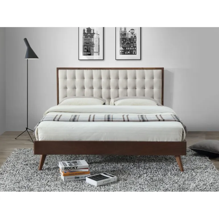 Oplev ultimativ komfort og stil med SOLOMO seng. Denne seng, lavet af førsteklasses stof og massivt gummitræ, kombinerer holdbarhed med et elegant design. Med dimensionerne 166/209/106 cm passer den perfekt til det moderne soveværelse. Vælg mellem en smuk beige farve eller en klassisk valnød finish. Bemærk venligst, at sengen leveres uden madras, men du kan tilkøbe den valgfri POLARIS 160x200cm madras for ekstra komfort.
