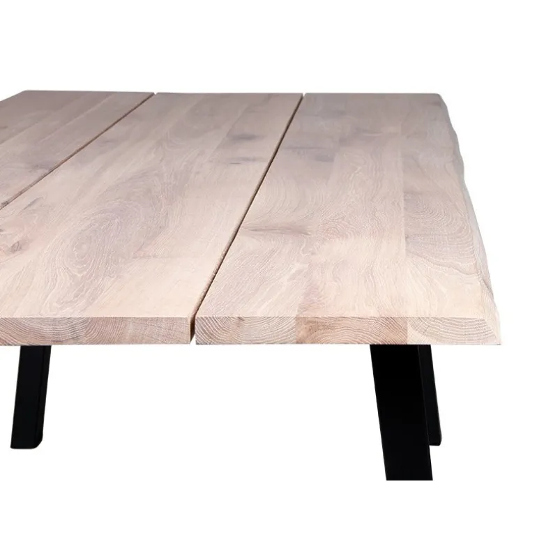 Spisebord af hvid olieret egetræsplanker med natur bølget skrå kanter. Pladen er to delt.