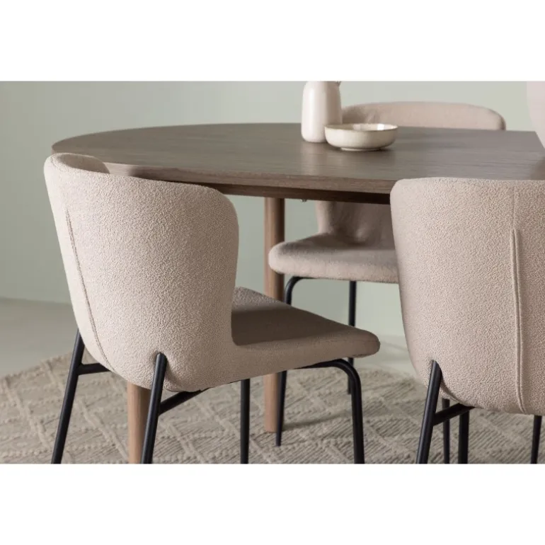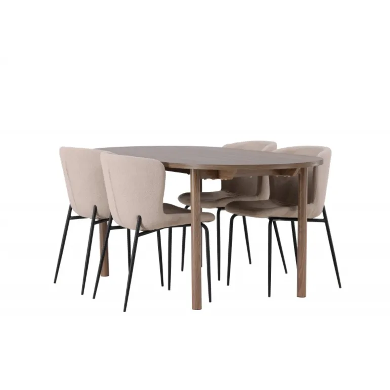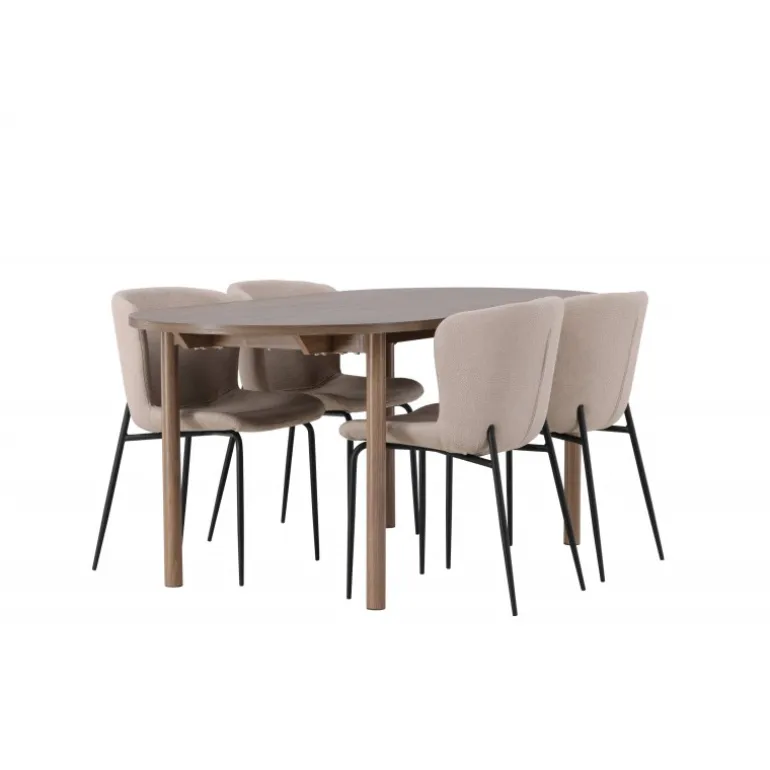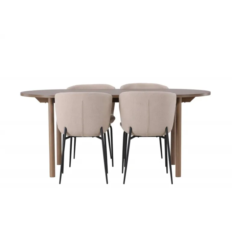 Et modebevidst Spisebordssæt – Gør dig klar til mange hyggelige måltider omkring dette charmerende, ovale spisebord med komfortable spisebordsstole, der udstråler luksus og modernitet! Vores mørkebrune spisebord Andy er den perfekte kombination af minimalistisk stil og uimodståelig charme. Med en oval og slank bordplade lavet af MDF og fire cylinderformede ben får du et klassisk spisebord, der fremhæver det moderne design takket være dets jordfarve. Bordmål: 180x75cm. Her i perfekt kombination med vores charmerende spisebordsstole fra Modesto-serien. Med deres skandinaviske design og beige fluffy stofbetræk skaber disse stole en varm og indbydende atmosfære. De slanke, sorte metalben komplementerer stolens udseende perfekt. Den let afrundede ryg og polstrede sædehynde giver ekstra komfort, så du kan nyde lange og behagelige middage med familie og venner. Det skal føles godt at komme hjem! Dette Spisebordssæt giver dig virkelig den afslapning, du har brug for, og spreder varme og ro i dit hjem, hvilket skaber den hyggelige atmosfære, du længes efter!