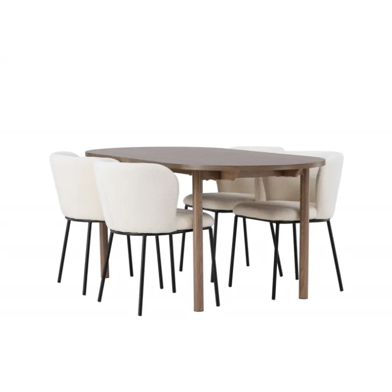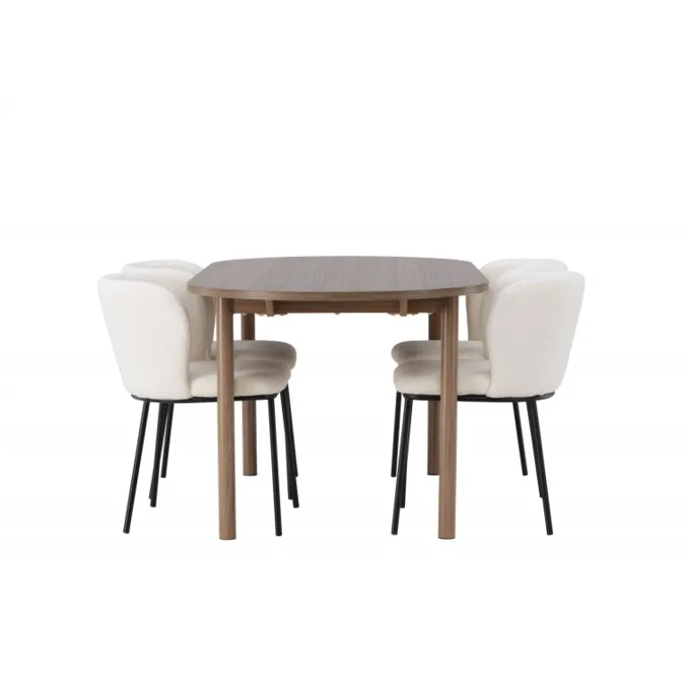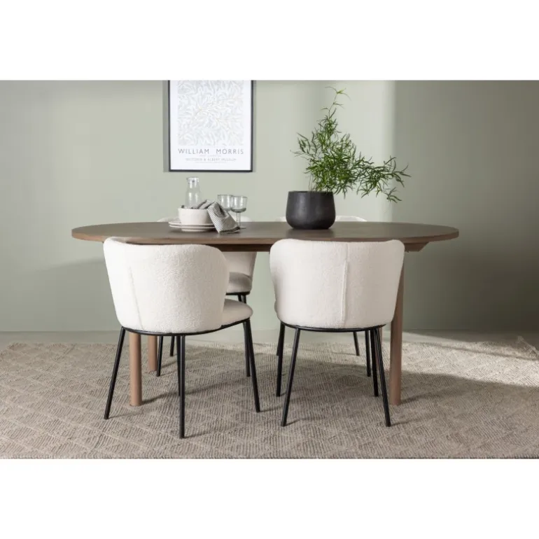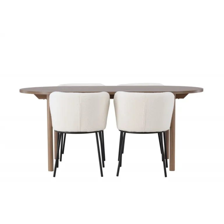 Det bliver ikke meget mere stilfuldt og charmerende end dette. Dette Spisebordssæt kombinerer de bedste nuværende trends med sin skandinaviske stil, bløde former og bæredygtige materialer! Vores ovale spisebord Andy kombinerer elegance og charme på den bedst mulige måde. Den tynde bordplade lavet af MDF og de cylinderformede ben giver en luftig følelse til rummet. Med sin konsekvente naturlige farve er det let at matche spisebordet med din øvrige indretning og skabe en harmonisk atmosfære. Bordet måler: 180×75 cm. Her har vi parret det naturligfarvede spisebord med slanke spisestole fra Edina-serien. Stolen har et sømløst og fuldt polstret sæde i hvid bouclé stof, hvilket tilføjer et luksuriøst touch til din spisestue. De minimalistiske sorte metalben på stolen komplimenterer det slanke design på en elegant måde. Du vil sidde her længe og nyde lækre måltider med familie og venner. Pynt dit hjem med disse fantastiske møbler og nyd et Spisebordssæt, der virkelig vil imponere dine gæster!