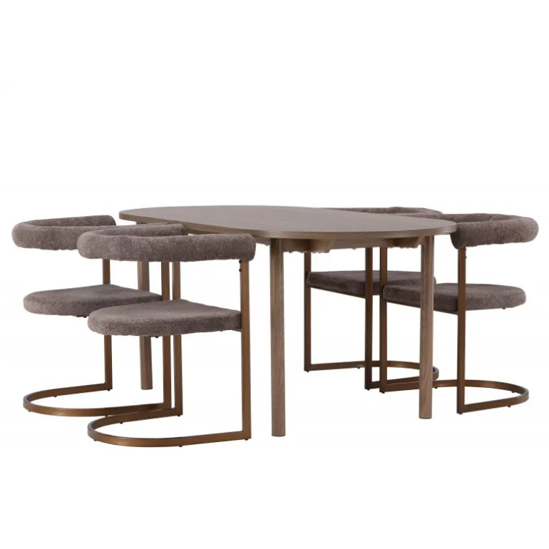 Andy spisestuebord og Morning stole tilbyder en trendy og komfortabel løsning til din spisestueindretning. Andy spisestuebord bringer en naturlig og varm følelse til din spisestue med sin MDF-bordplade og naturfarvede stålben. Med sine generøse dimensioner på 180×90 cm og en højde på 75 cm, giver dette bord masser af plads til måltider og samlinger. Morning stolene komplementerer bordet med deres moderne design og komfortable siddekomfort i grå Polyester Boucle. Stolenes brune stålrammer tilføjer et jordnært præg til rummet og tilbyder stabilitet. Dette Spisebordssæt inkluderer fire stole, hvilket gør det ideelt til familiemiddage og små sammenkomster. Med sit trendy design og varme atmosfære bliver dette ensemble til en perfekt indretningsdetalje for din spisestue. Skab en indbydende og stilfuld atmosfære med Andy spisestuebord og Morning stole.