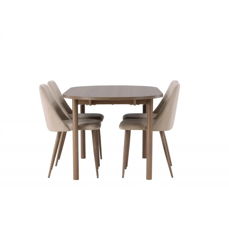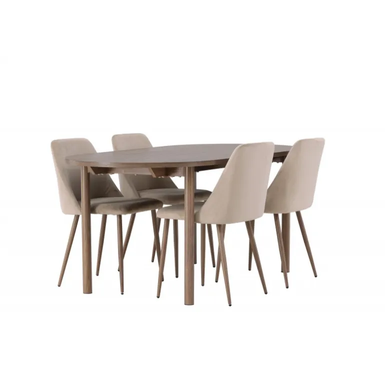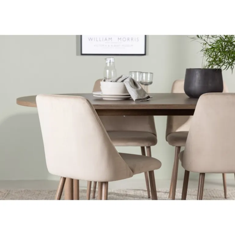 Inviter nære venner og kære til hyggelige måltider omkring et Spisebordssæt, der udstråler fællesskab og stil! Det ovale spisebord Andy er den perfekte kombination af minimalisme og charme. Den slanke, ovale MDF-bordplade og de cylindriske ben bidrager både til stabilitet og æstetik. Bordet har en jævn brun naturlig farve, der er nem at matche med andre interiørstile og aldrig går af mode. Dimensionerne på bordet er 180×75 cm. Sammen med det jordnære spisebord Andy følger de komfortable stole fra Night-serien. Denne stol er ikke kun komfortabel, men også en sand stil-ikon. Med et fuldt polstret sæde i brunt velourstof giver den en følelse af luksus og komfort. De elegante valnøddefarvede stålben på stolen komplementerer designet perfekt og tilføjer et sofistikeret touch. Uanset om du inviterer venner og familie til en festlig middag eller blot nyder et afslappet måltid alene, vil Andy og Night Spisebordssættet give dig en enestående følelse i dit hjem!
