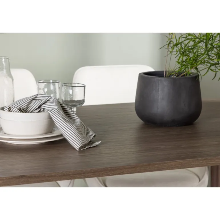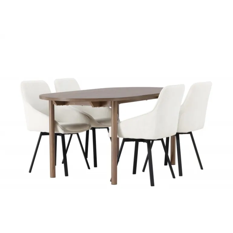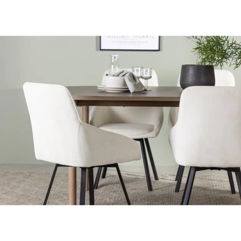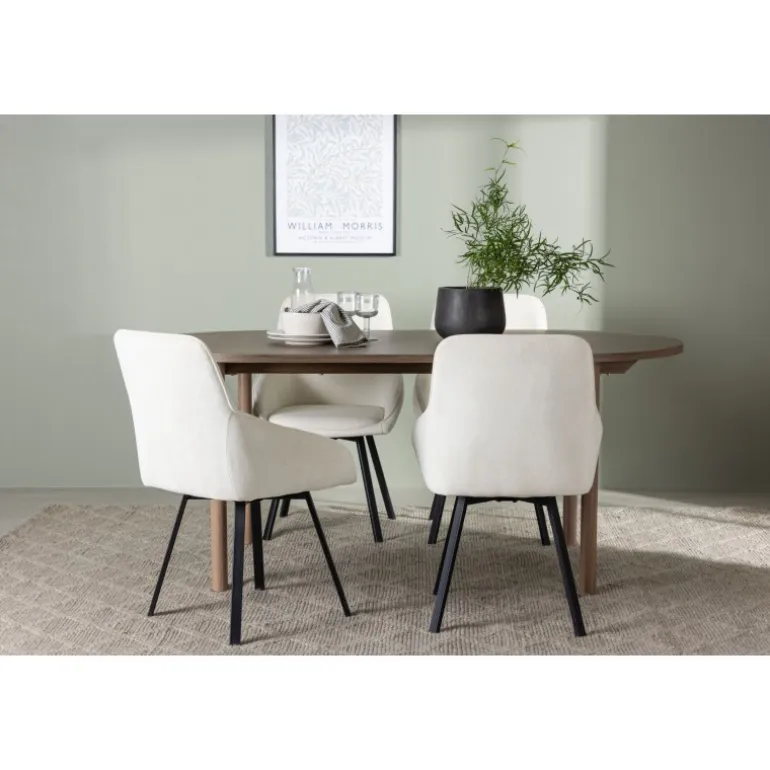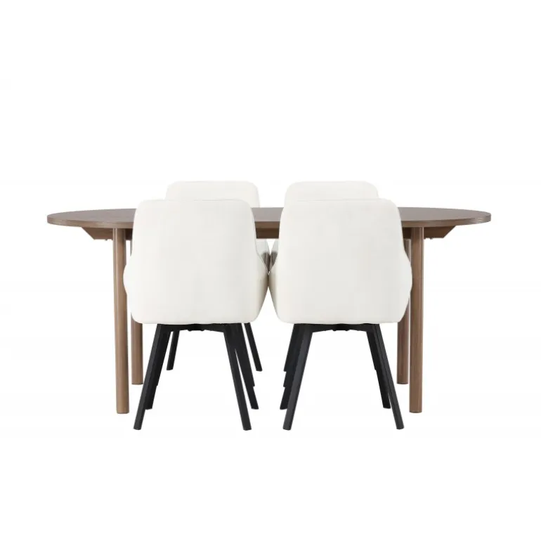 Oplev et lyst og frisk spisebordssæt i stilfulde farver, der nemt matcher anden indretning! Vores ovale spisebord, Andy, kombinerer minimalisme og charme på den perfekte måde. Med en tynd bordplade lavet af høj kvalitet MDF-materiale udstråler dette bord subtil luksus. Farven er jordnær i naturligt træ og føles lige så holdbar som tidløs. Bordets dimensioner er 180×75 cm. Her perfekt matchet med vores komfortable spisestole fra Rosie-serien. Denne dejlige stol i skandinavisk design vil blive din personlige favorit med hensyn til komfort og stil. Stolen har en fuldt polstret sæde i beige stof, der giver et sofistikeret touch, og integrerede armlæn, der tilbyder ekstra støtte og afslapning. De let spredte stoleben i sort metal giver et moderne og elegant udtryk til hele spisebordssættet. Skab mindeværdige øjeblikke med familie og venner omkring dette fantastiske spisebord og nyd den ultimative komfort, som Rosie-stolen tilbyder. Sæt tonen i spisestuen med dette indbydende spisebordssæt – ingen vil blive overset!