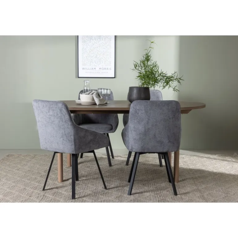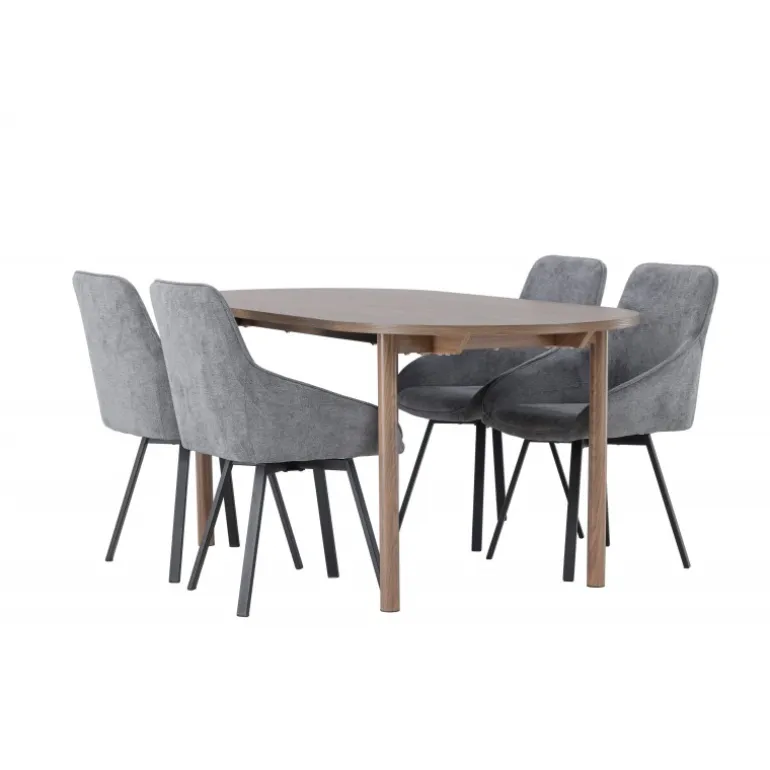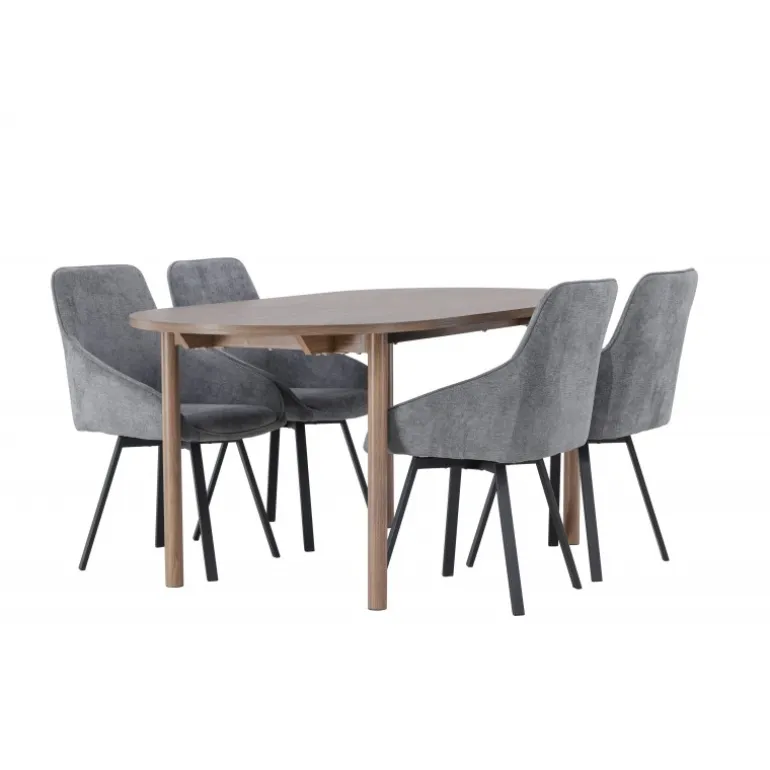 Et Spisebordssæt i behagelige farver, der er nemme at matche med anden indretning og stil! Vores ovale spisebord, Andy, er den perfekte kombination af minimalisme og charme. Med en slank bordplade lavet af højkvalitets MDF-materiale udstråler dette bord subtil luksus. Farven er jordnær i naturligt træ og føles lige så holdbar som tidløs. Bordets dimensioner: 180×75 cm. Her perfekt matchet med vores komfortable spisestole fra Rosie-serien. Denne dejlige stol i skandinavisk design vil blive din personlige favorit inden for komfort og stil. Stolen har et fuldt polstret sæde i gråt stof, der tilføjer et sofistikeret touch, og integrerede armlæn, der giver ekstra støtte og afslapning. De blidt buede sorte metalben på stolen giver et moderne og elegant udtryk til hele Spisebordssættet. Skab mindeværdige øjeblikke med familie og venner omkring dette fantastiske spisebord og nyd den ultimative komfort, som Rosie-stolen tilbyder. Sæt tonen i spisestuen med dette indbydende Spisebordssæt – ingen vil blive efterladt på kanten!