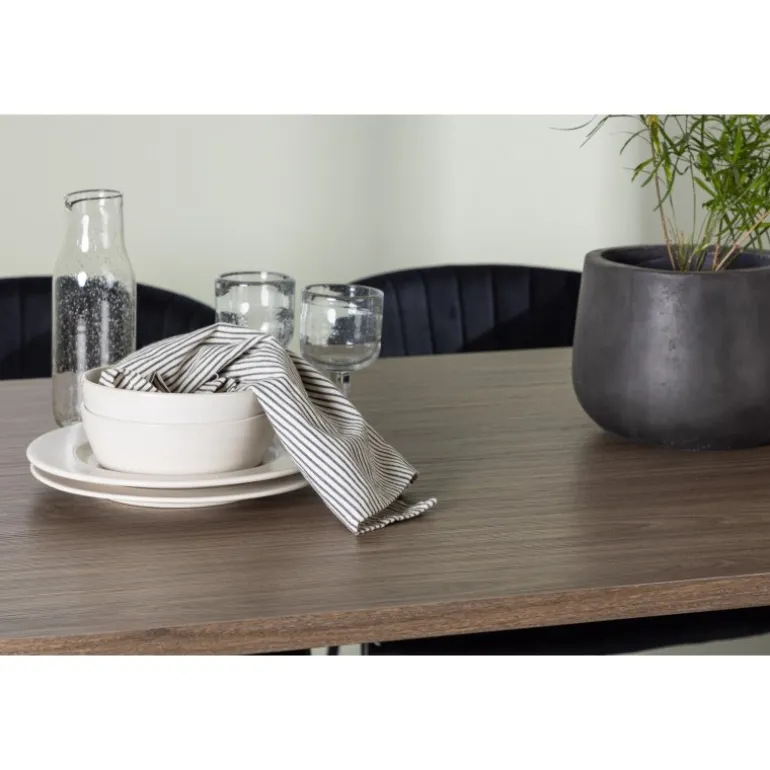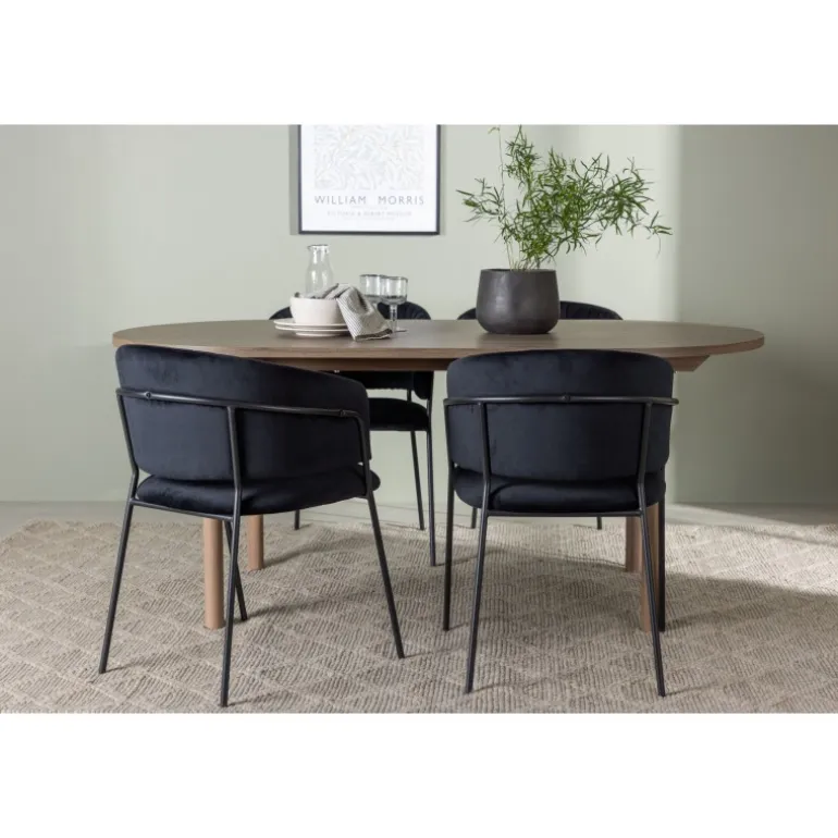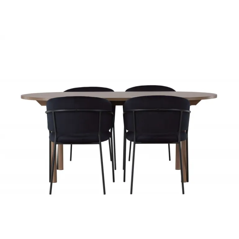 Spisebordssættet Andy med stole Selma tilbyder en distinkt og unik stil til din spisestueindretning. Med en naturlig farvepalet bringer Andy spisebordet en jordnær og varm følelse til rummet. Bordpladen i MDF og de sorte stålben giver et robust og moderne udtryk. Med mål på 180×90 cm og en højde på 75 cm skaber det en imponerende og funktionel overflade til middage og sociale sammenkomster. Selma stolene løfter designet med deres trendy og elegante, fuldt polstrede sæder i sort polyesterfløjl. Stolenes sorte stålben, med deres let udadgående former, giver ikke kun stabilitet, men også en unik visuel effekt. De let rundede rygge på stolene tilbyder ekstra komfort og en afslappet atmosfære omkring bordet. Med Andy spisebord og Selma stole får du mere end blot et almindeligt Spisebordssæt; du får en raffineret og unik interiørdetalje, der løfter hele rummets atmosfære til nye højder. Med kombinationen af gennemtænkt design og trendsans skaber dette ensemble et spændende og personligt udtryk til dit hjem.