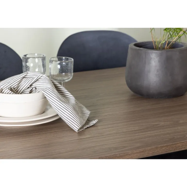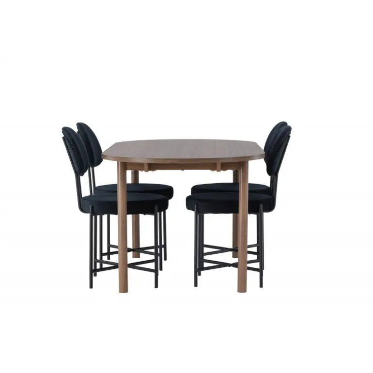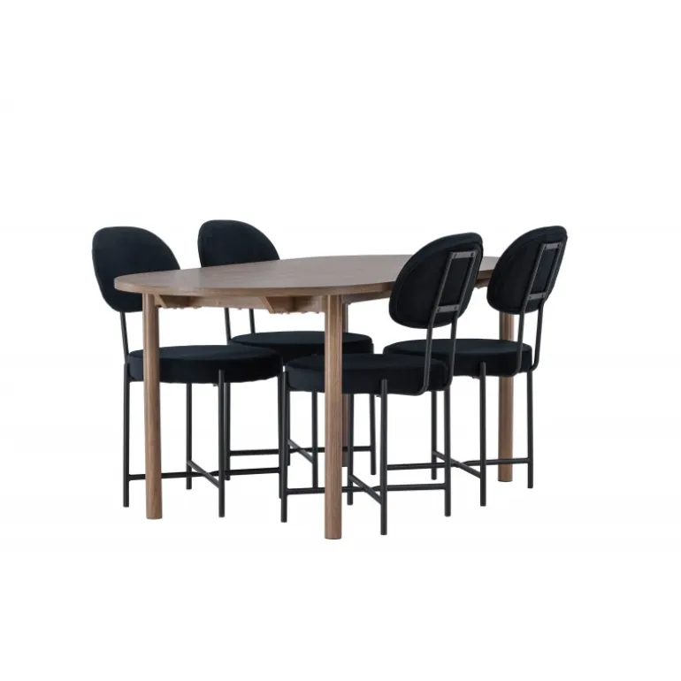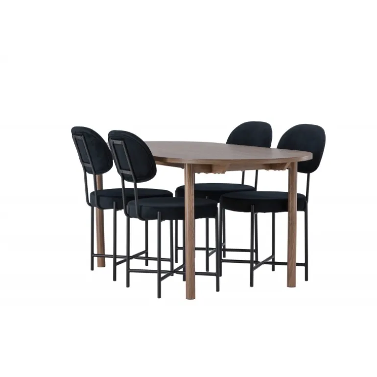 Velkommen hjem til et moderne Spisebordssæt i jordfarver, bløde materialer og slanke former! Vores mørkebrune spisebord, Andy, har et charmerende design og en klassisk opstilling. Med en oval, tynd bordplade lavet af høj kvalitet MDF-materiale, tilbyder dette bord et smagfuldt og moderne look, der vil imponere både familie og venner. Bordbenene er slanke og klassisk cylindriske. Den mørkebrune træfarve har et tidløst og moderne udseende, der aldrig går af mode. Bordets dimensioner er 180×75 cm. Her, i perfekt kombination, er vores slanke sorte spisestole fra Stella-serien. Stolenes trendy skandinaviske design tilføjer et sofistikeret touch til din indretning. Det runde sæde og ryglæn i sort velourstof giver en elegant og luksuriøs følelse, mens de minimalistiske sorte stålstoleben tilbyder en moderne og robust struktur. Med dette Spisebordssæt vil du kunne nyde hvert måltid med stil og komfort. Den designrige siddeposition og de eksklusive materialer i både bord og stole vil give dig en følelse af luksus og velvære!